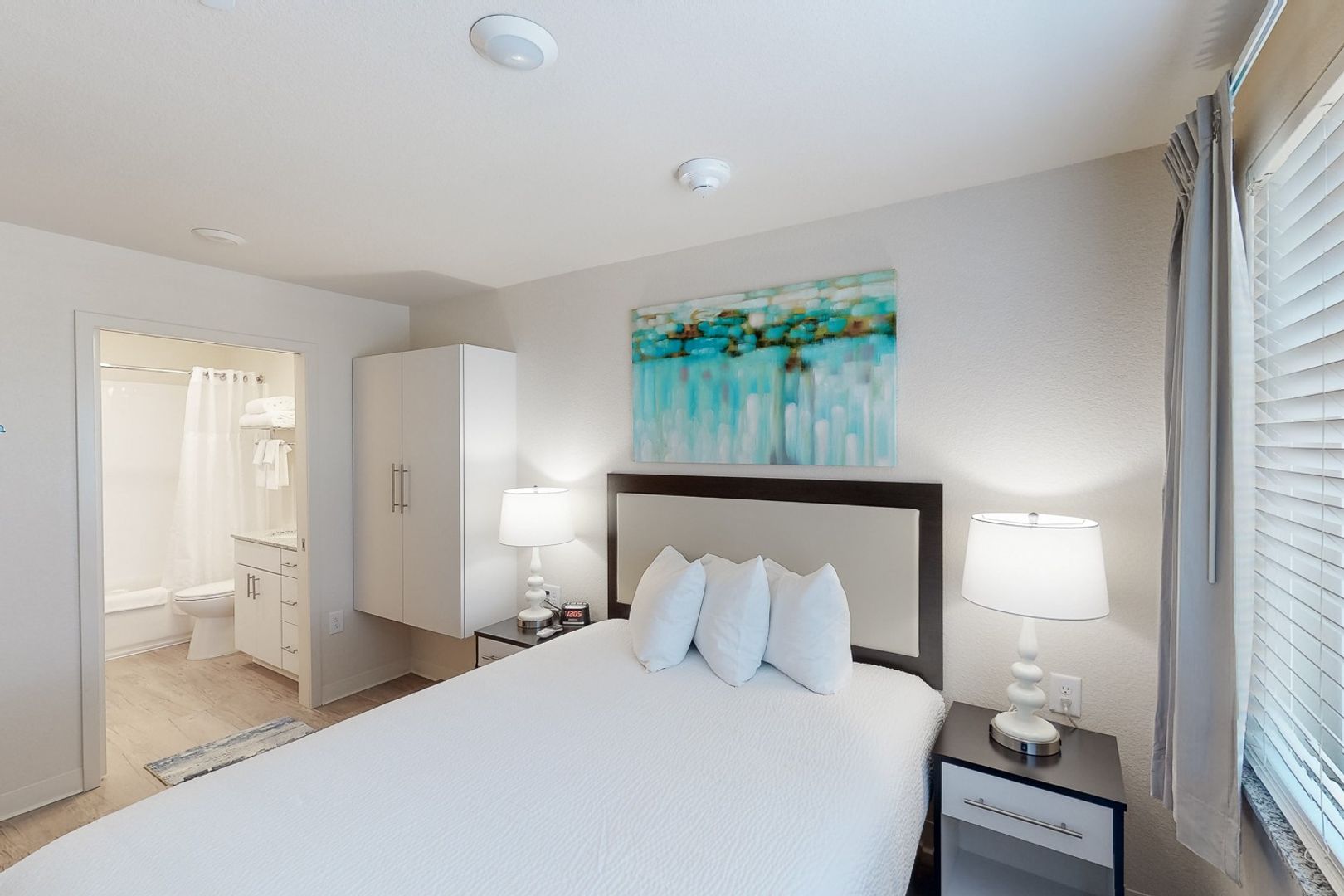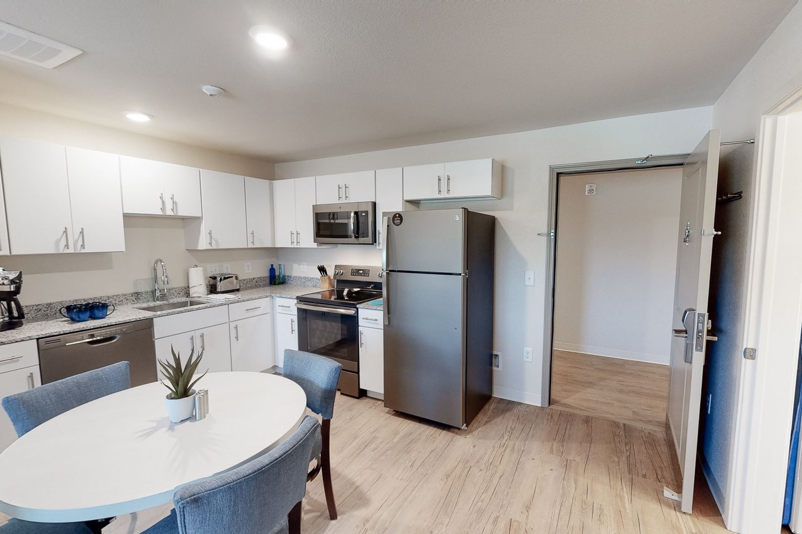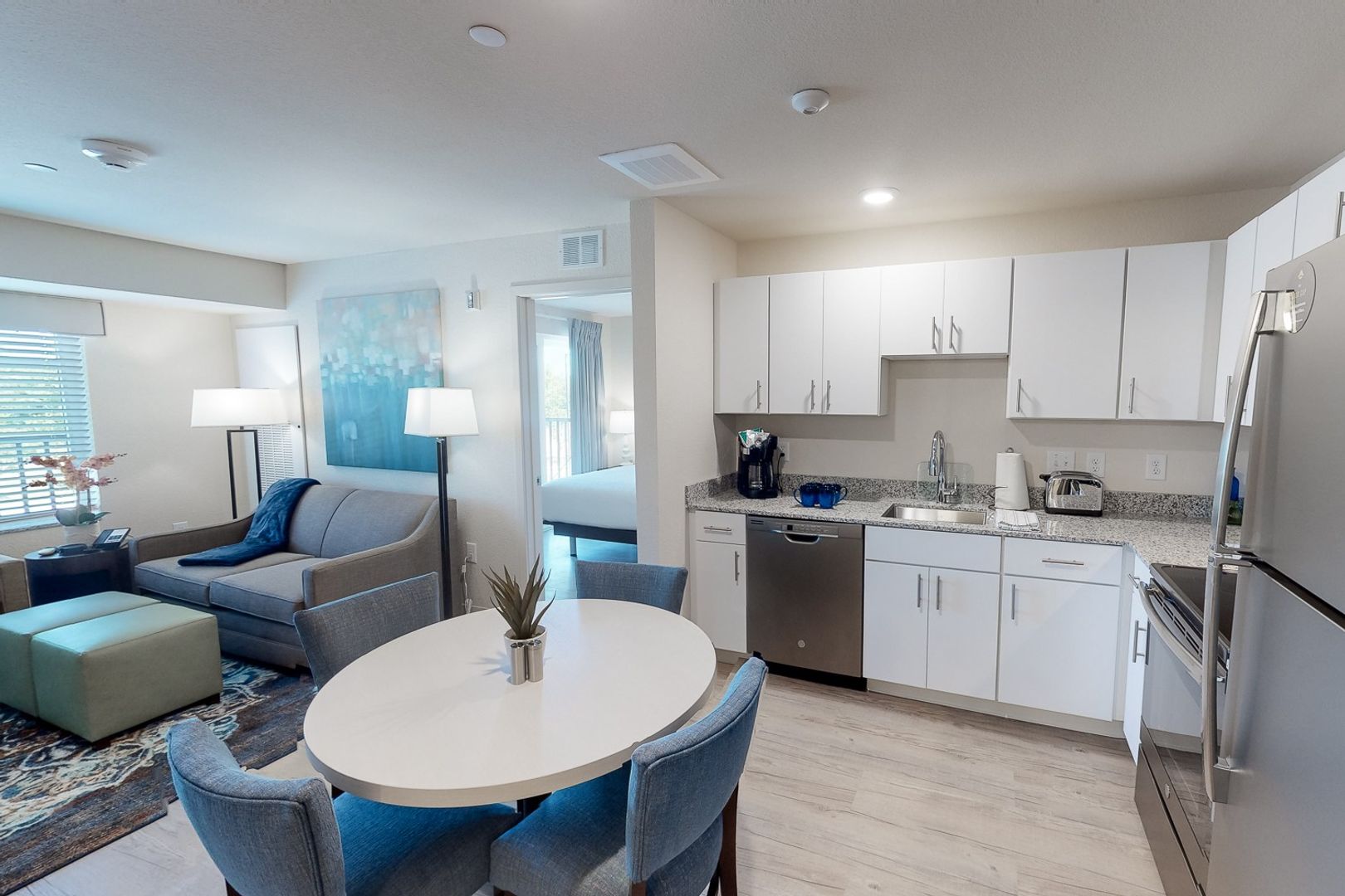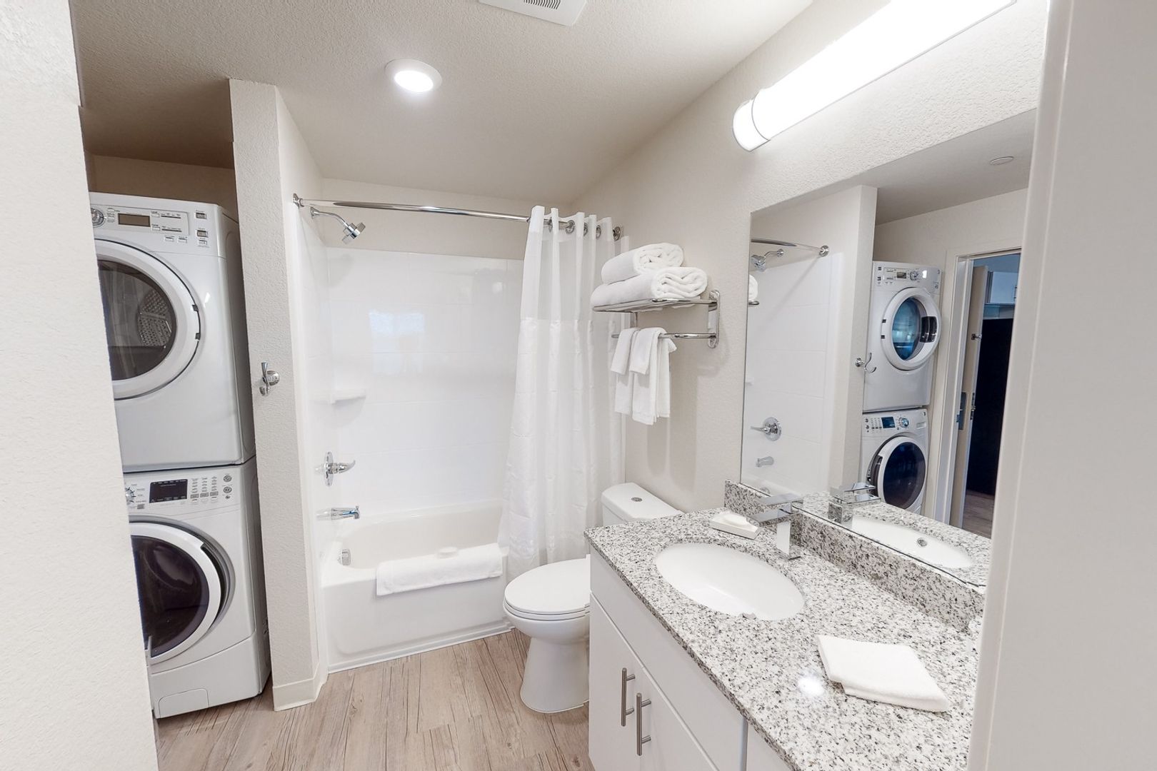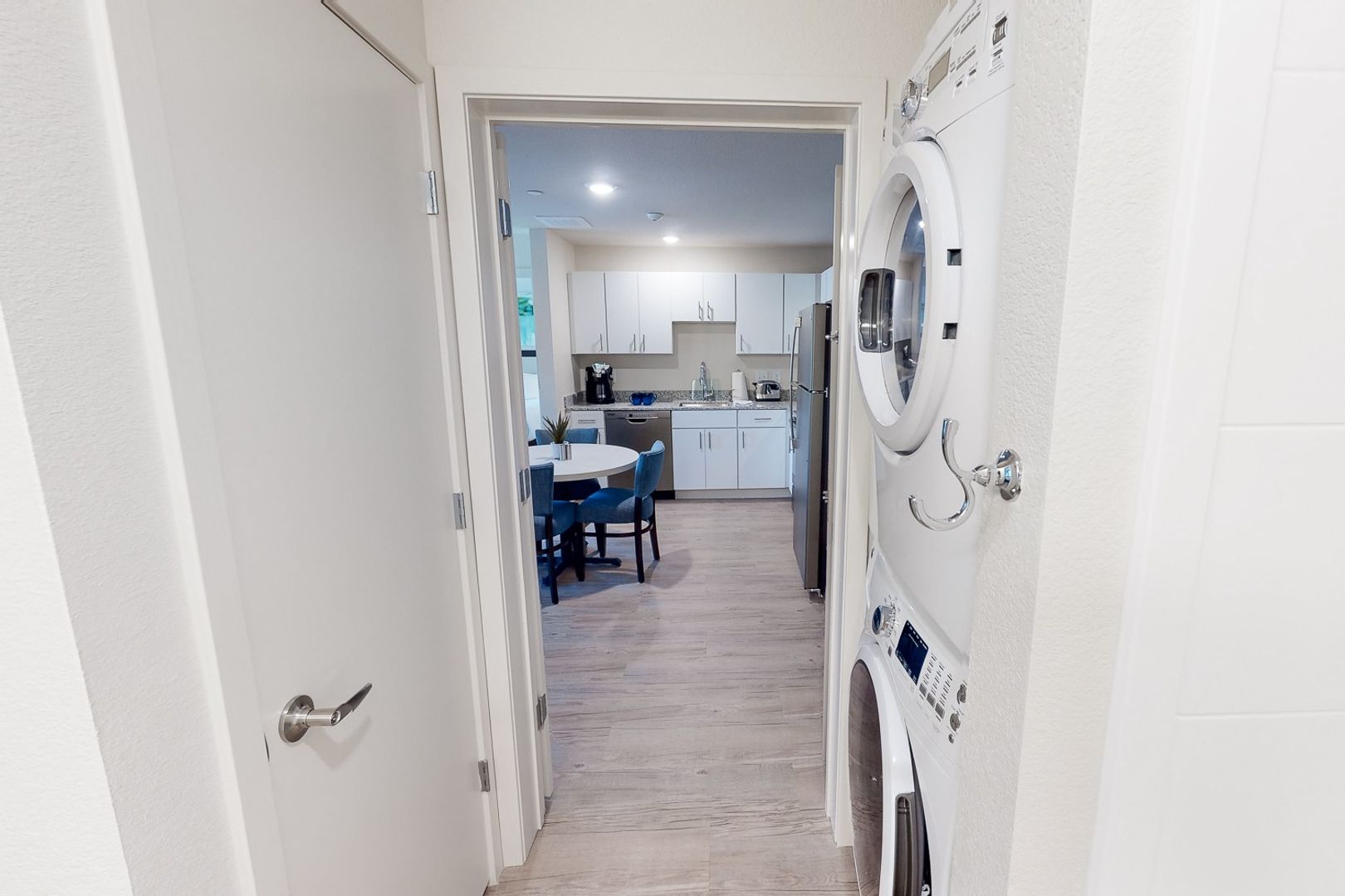 Two-bedroom, two-bathroom unfurnished suite with private balcony featuring a modern kitchen equipped with full-size appliances, including a refrigerator, dishwasher, microwave, stove, and oven. It also features a full-size washer and dryer for added convenience. The living area offers ample comfort, while the bedroom is designed with a calming color palette, providing space for a queen-size bed and a closet system with smart storage shelving.
