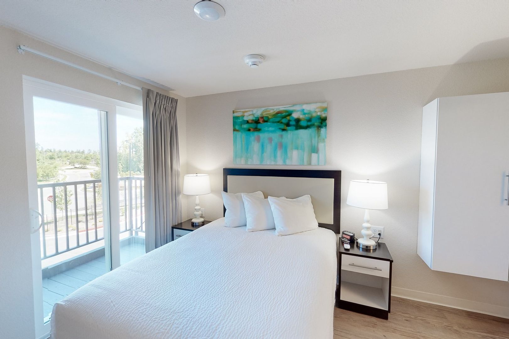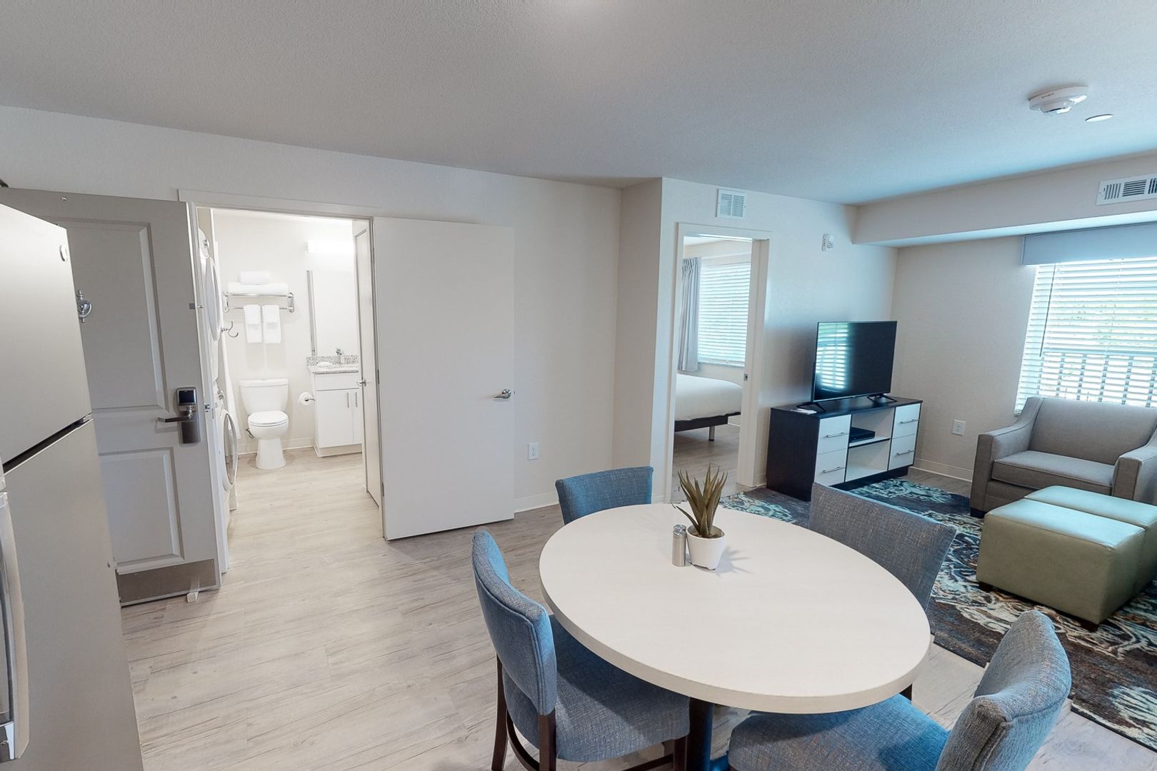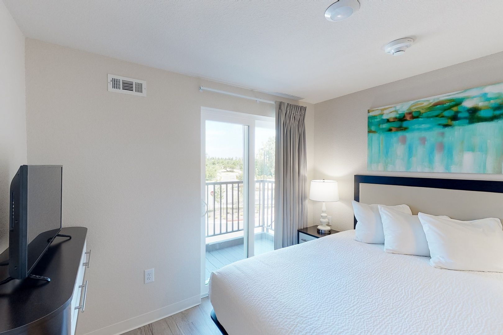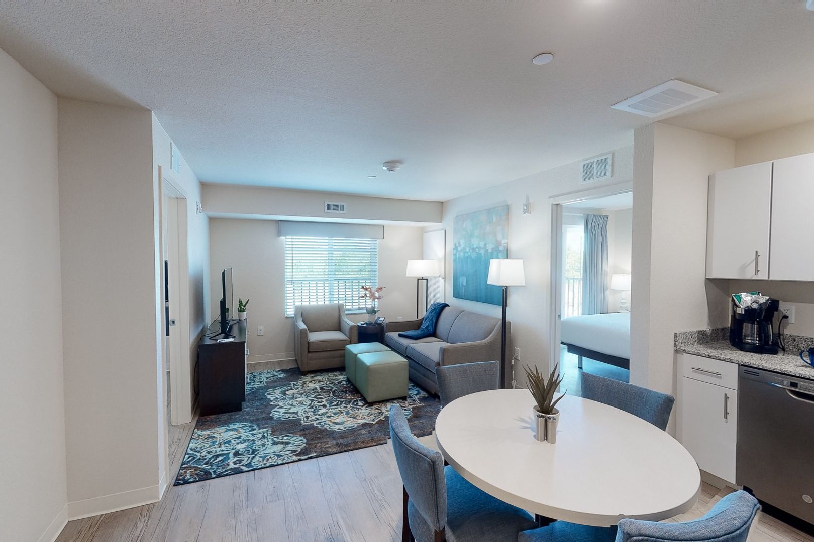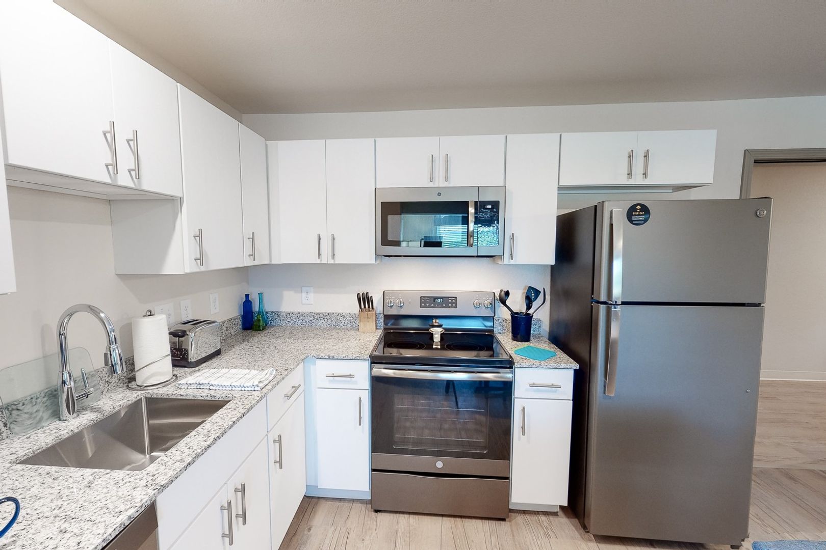 Two-bedroom, two-bathroom unfurnished suite with private balcony featuring a modern kitchen equipped with full-size appliances, including a refrigerator, dishwasher, microwave, stove, and oven. It also features a full-size washer and dryer for added convenience. The living area offers ample comfort, while the bedroom is designed with a calming color palette, providing space for a queen-size bed and a closet system with smart storage shelving.