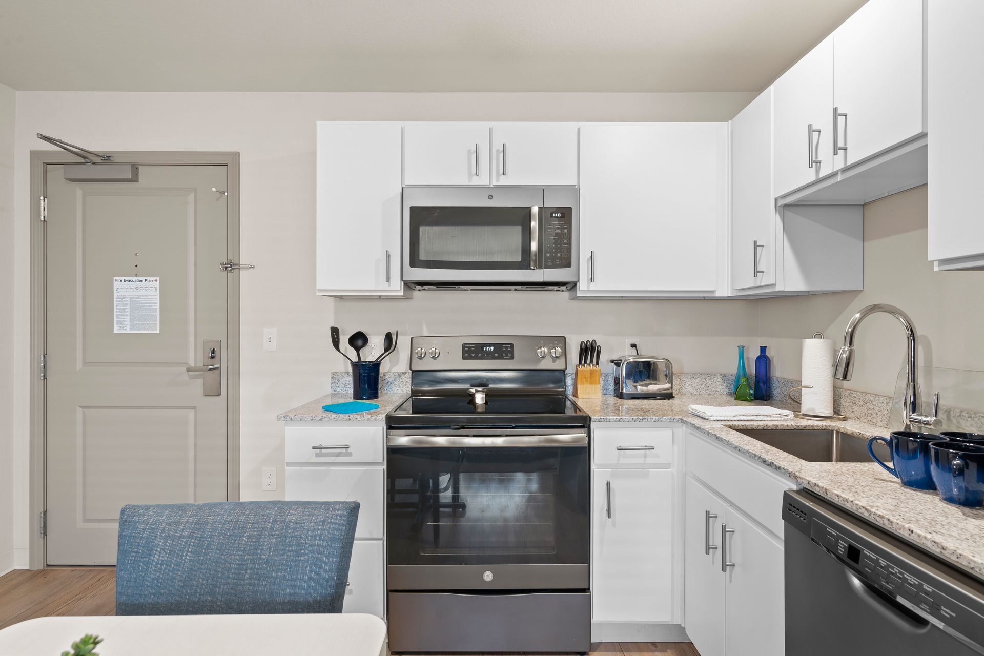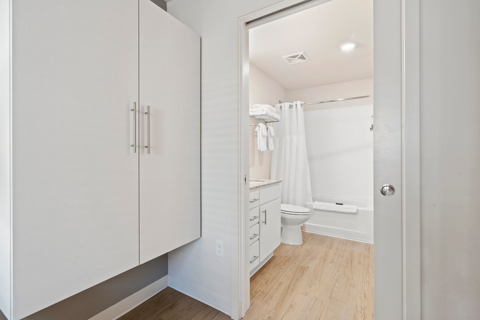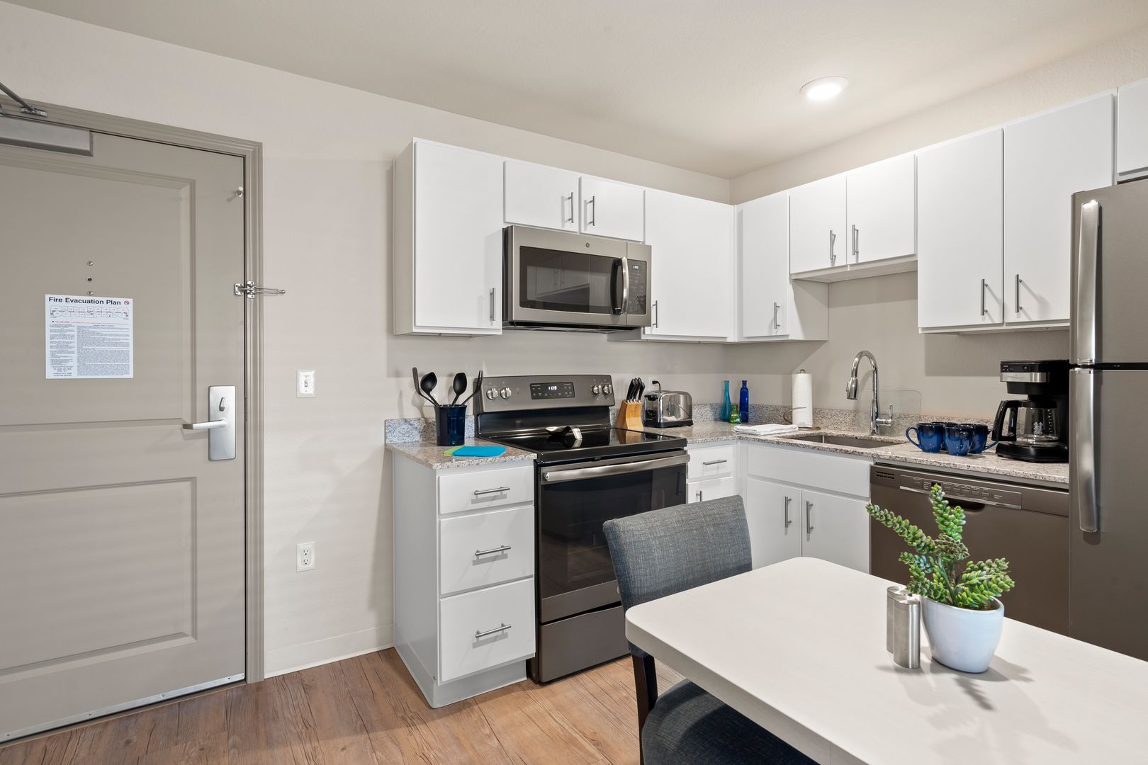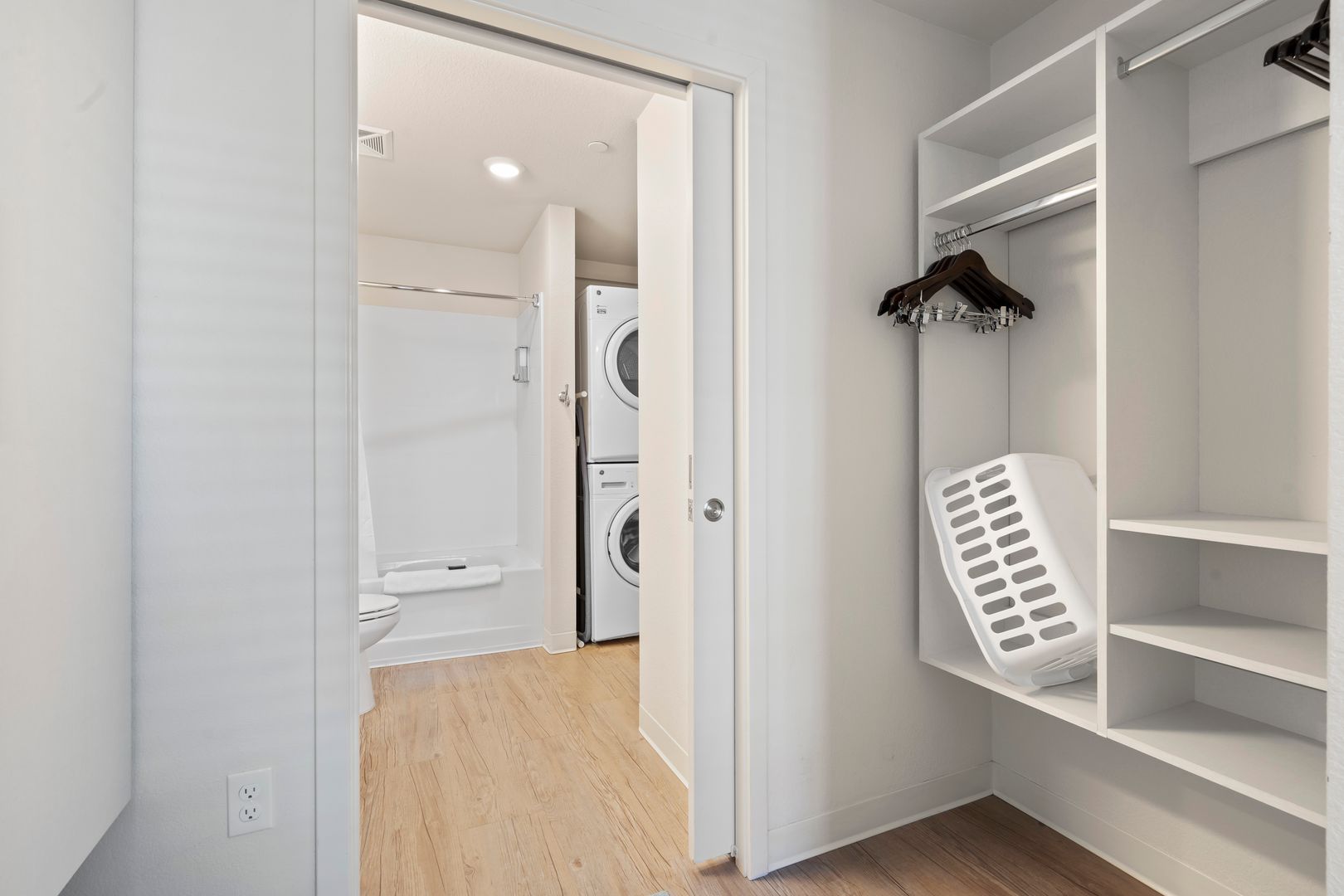Two-bedroom, two-bathroom unfurnished suite featuring a modern kitchen equipped with full-size appliances, including a refrigerator, dishwasher, microwave, stove, and oven. It also features a full-size washer and dryer for added convenience. The living area offers ample comfort, while the bedroom is designed with a calming color palette, providing space for a queen-size bed and a closet system with smart storage shelving.