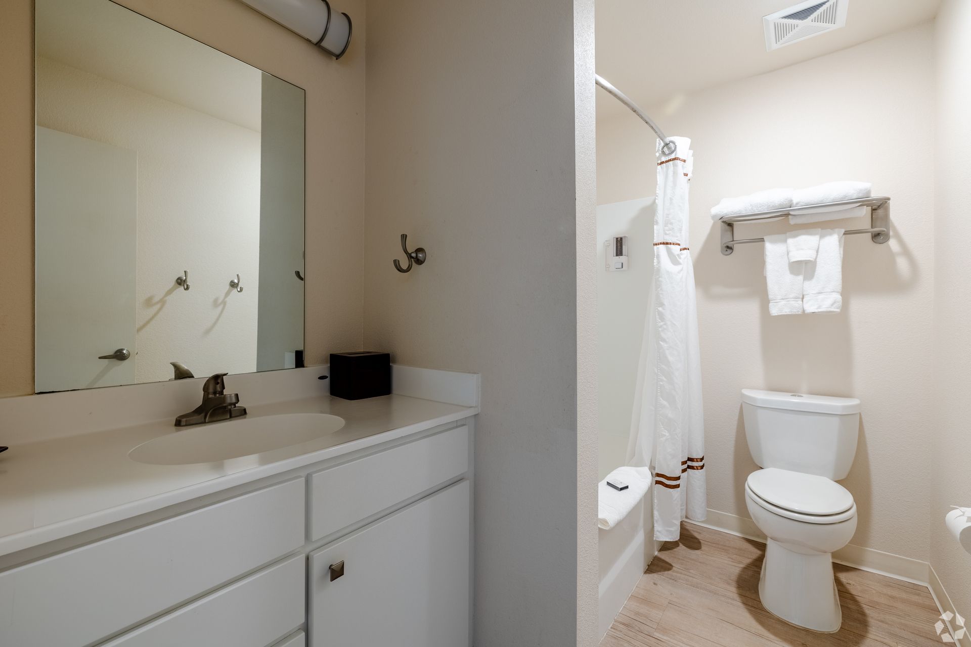 Three-bedroom, two-bathroom unfurnished suite featuring a modern kitchen equipped with full-size appliances, including a refrigerator, dishwasher, microwave, stove, and oven. It also features a full-size washer and dryer for added convenience. The living area offers ample comfort, while the bedroom is designed with a calming color palette, providing space for a queen-size bed and a closet system with smart storage shelving.
