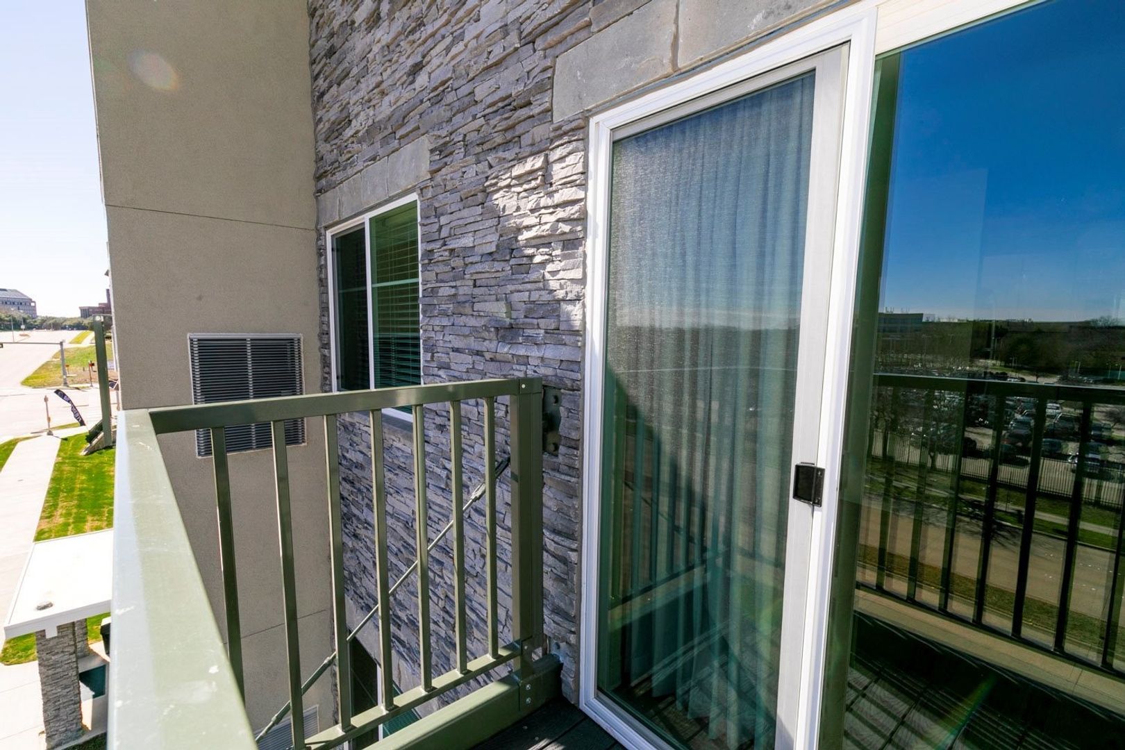 One-bedroom, one-bathroom unfurnished suite with private balcony featuring a modern kitchen equipped with full-size appliances, including a refrigerator, dishwasher, microwave, stove, and oven. It also features a full-size washer and dryer for added convenience. The living area offers ample comfort, while the bedroom is designed with a calming color palette, providing space for a queen-size bed and a closet system with smart storage shelving.