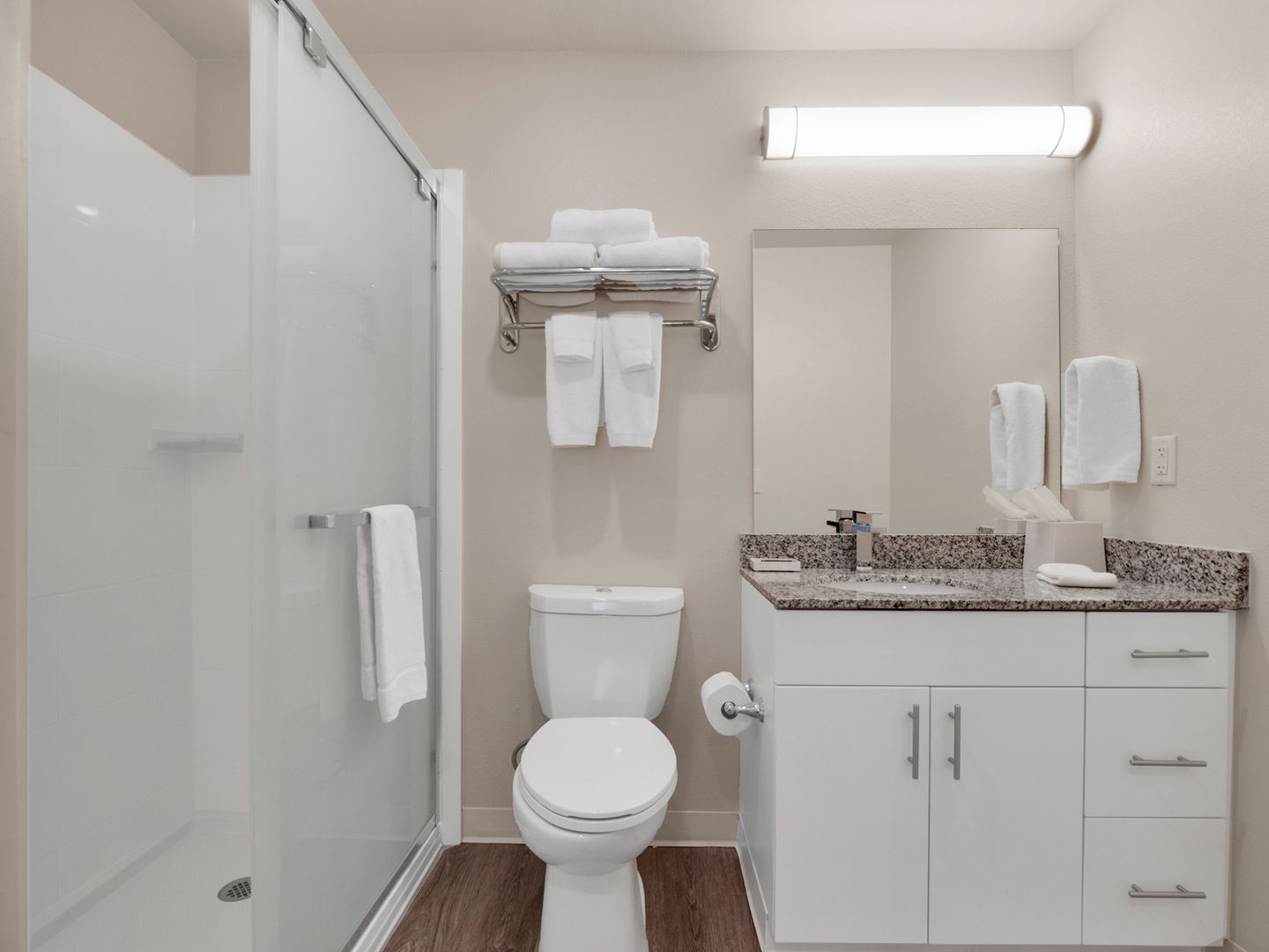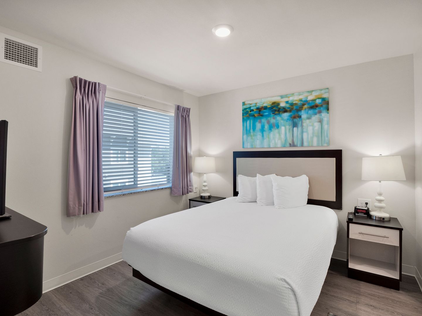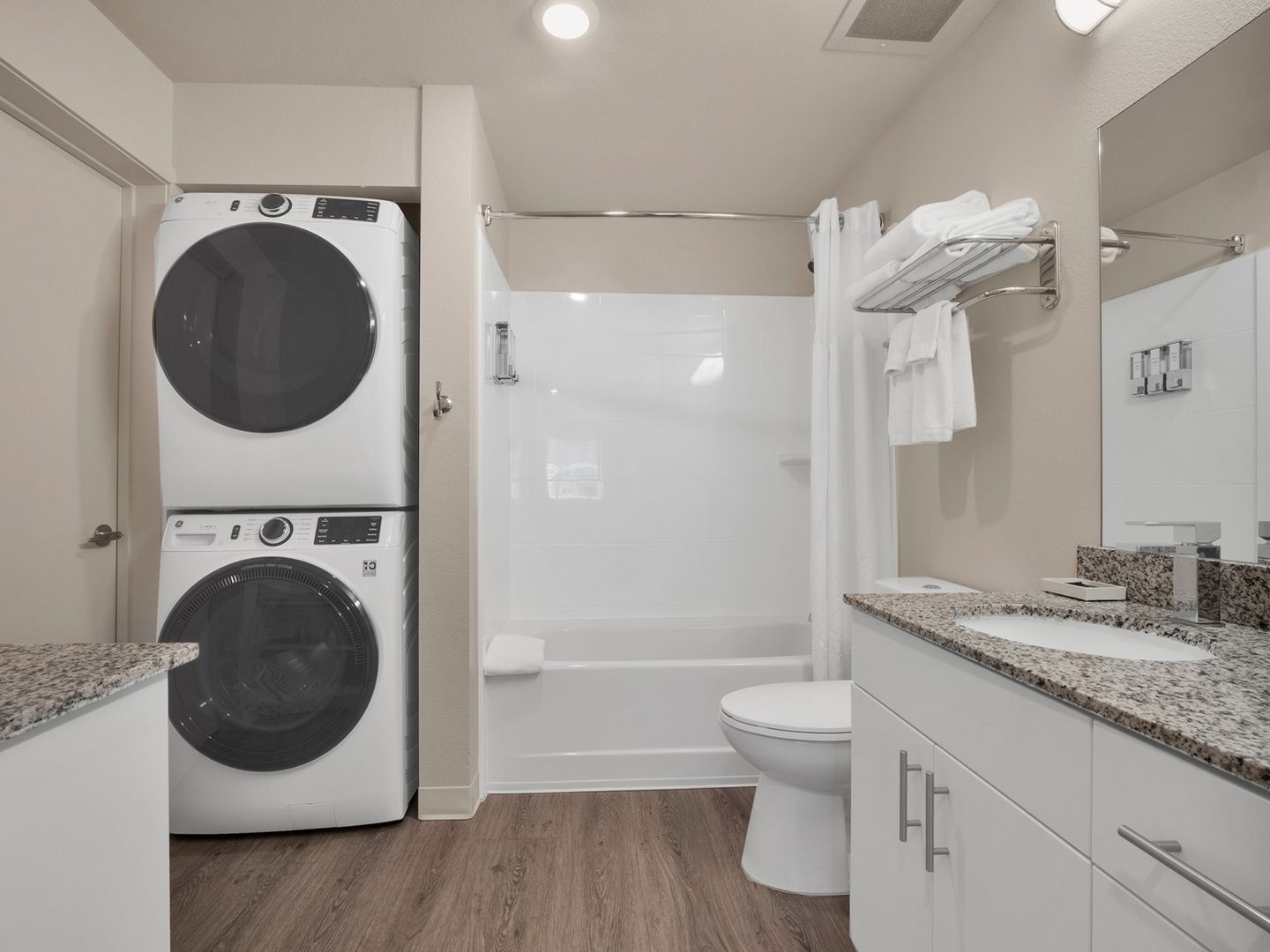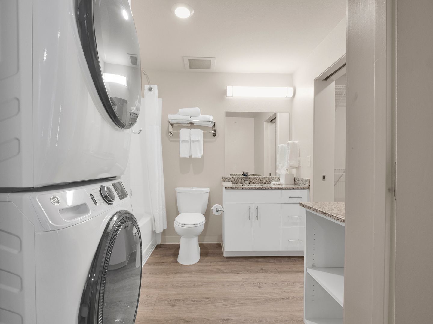 Two-bedroom, two-bathroom unfurnished suite featuring a modern kitchen equipped with full-size appliances, including a refrigerator, dishwasher, microwave, stove, and oven. It also features a full-size washer and dryer for added convenience. The living area offers ample comfort, while the bedroom is designed with a calming color palette, providing space for a queen-size bed and a closet system with smart storage shelving.