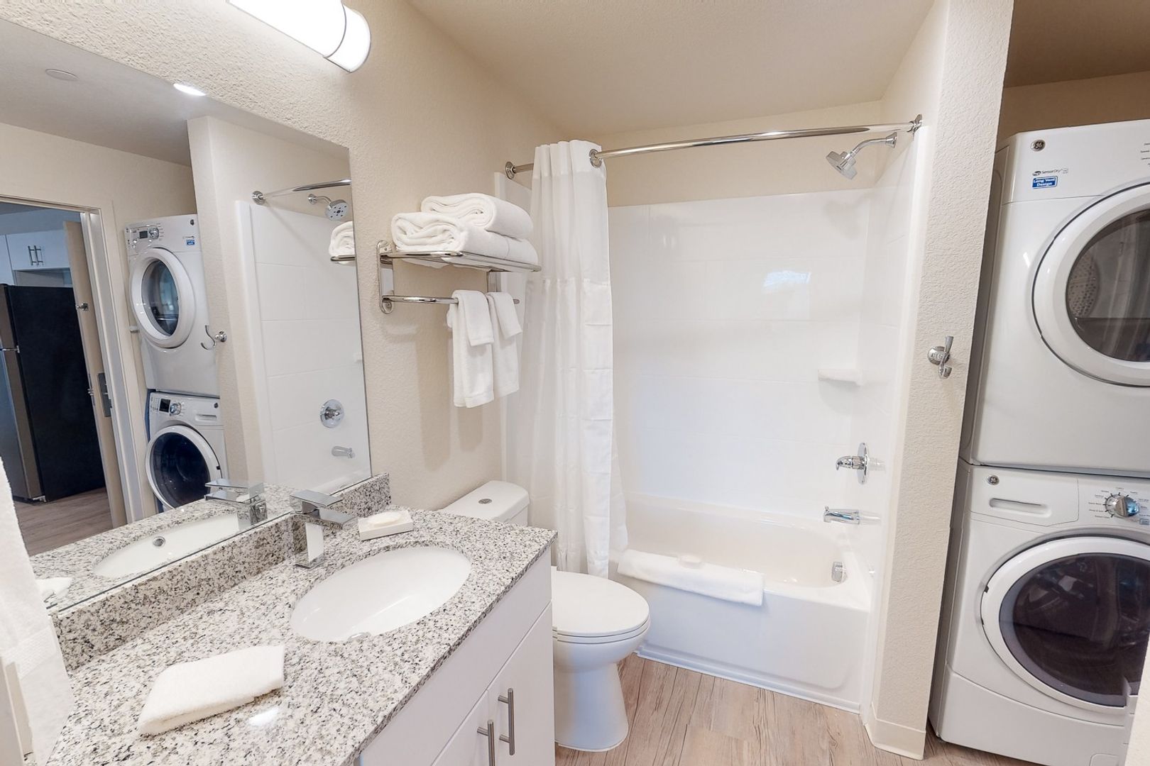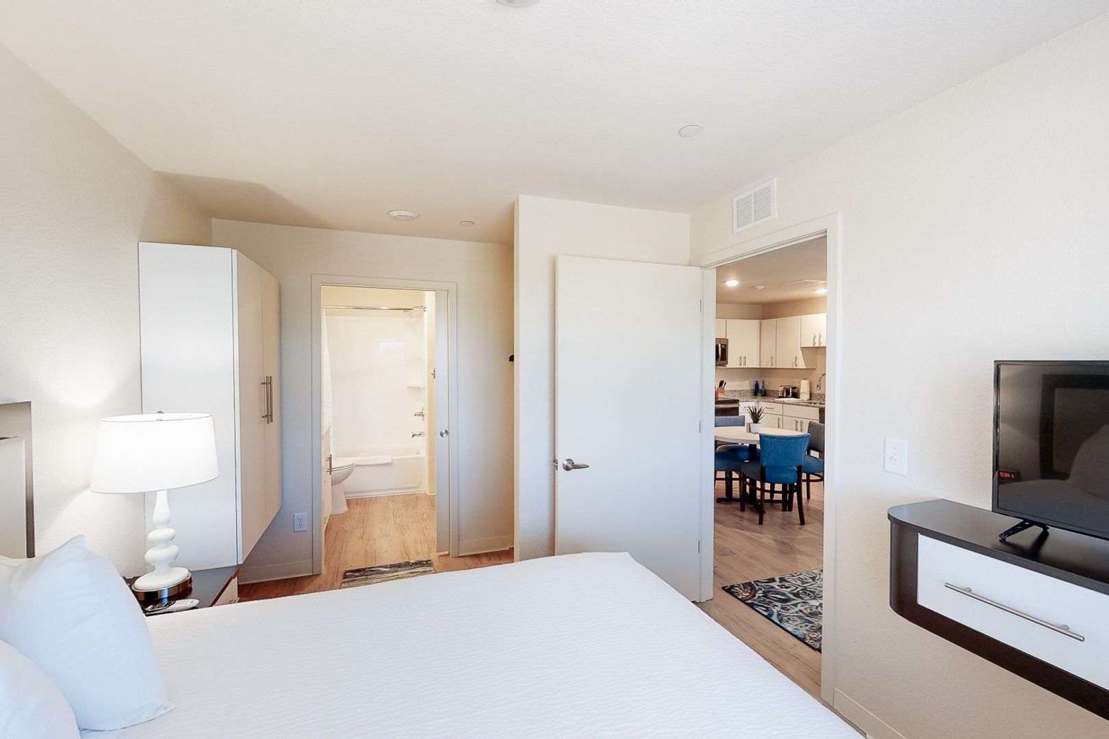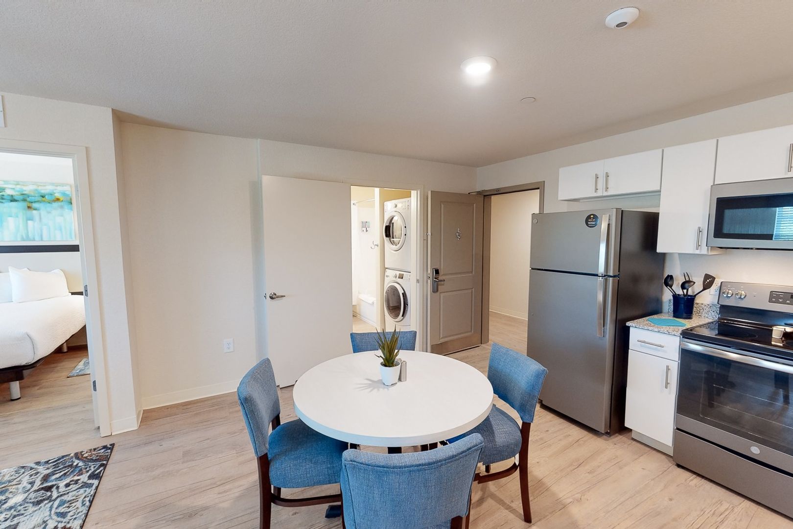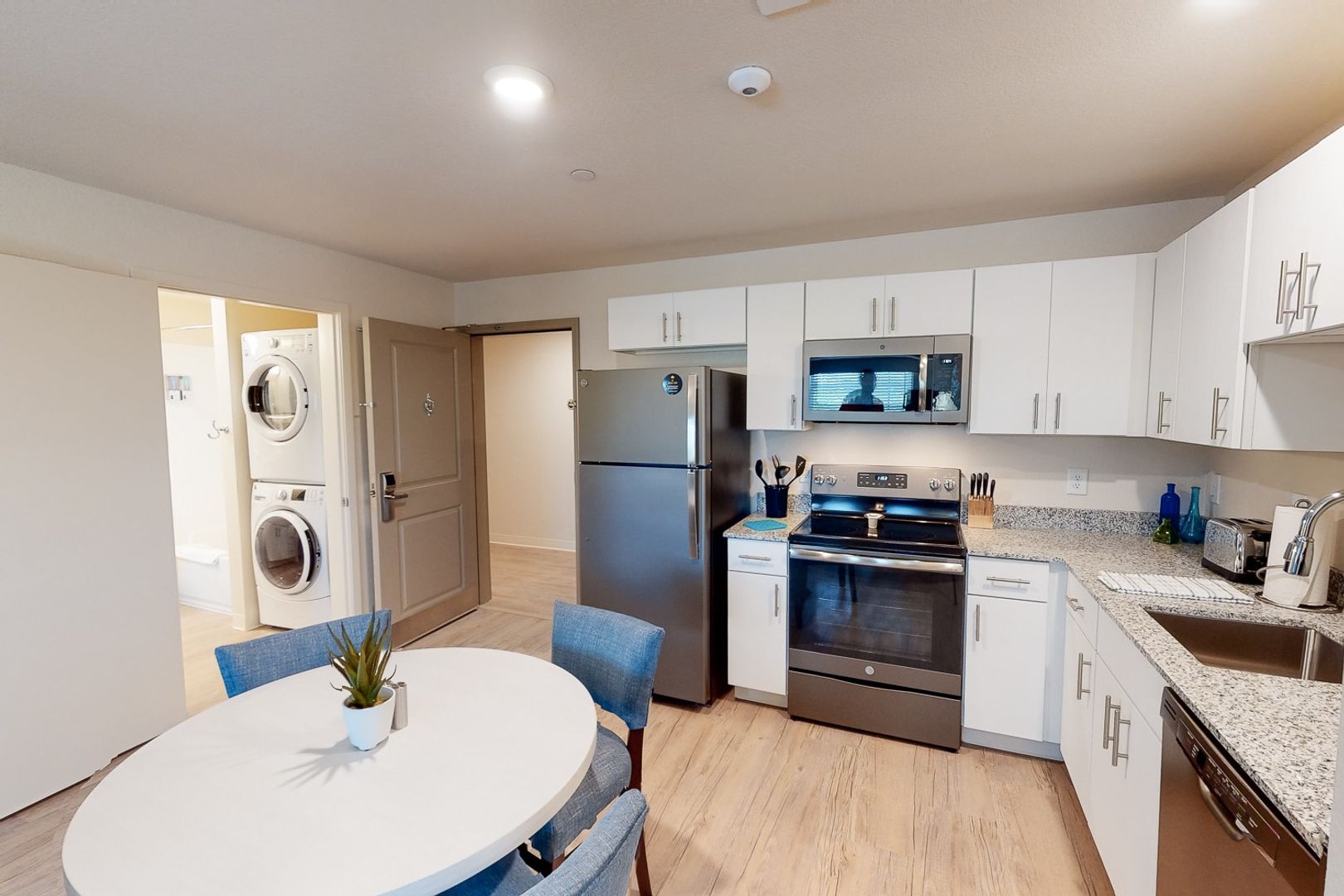 Two-bedroom, two-bathroom unfurnished suite featuring a modern kitchen equipped with full-size appliances, including a refrigerator, dishwasher, microwave, stove, and oven. It also features a full-size washer and dryer for added convenience. The living area offers ample comfort, while the bedroom is designed with a calming color palette, providing space for a queen-size bed and a closet system with smart storage shelving.