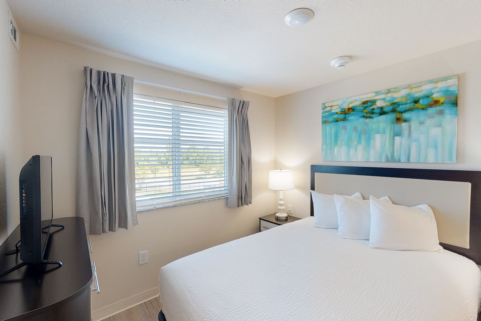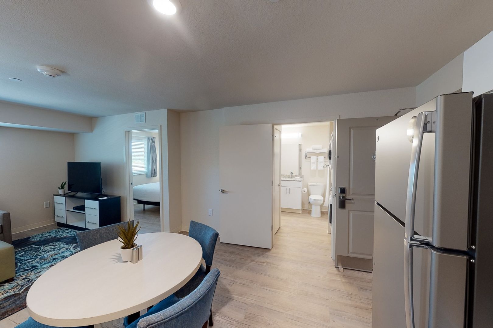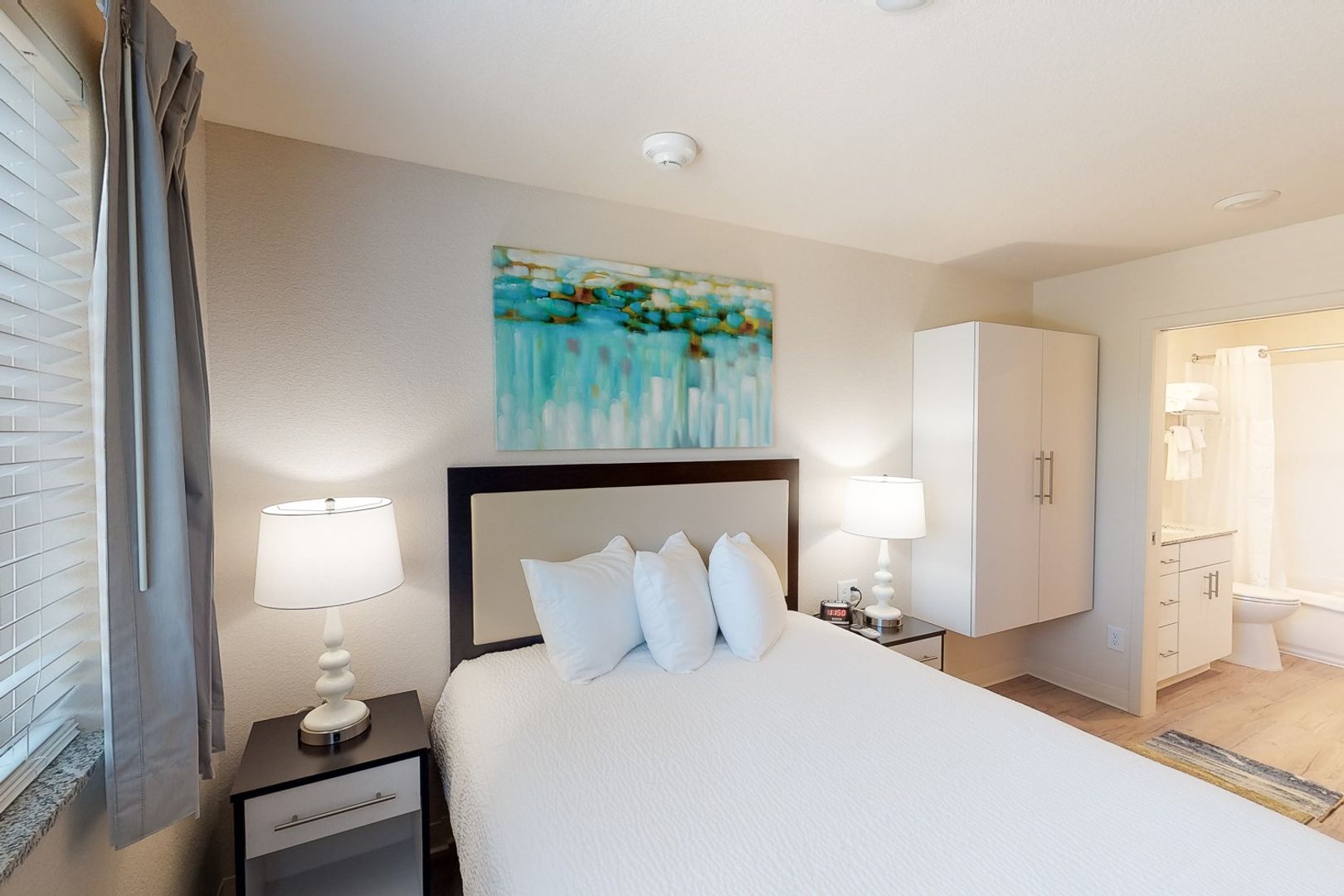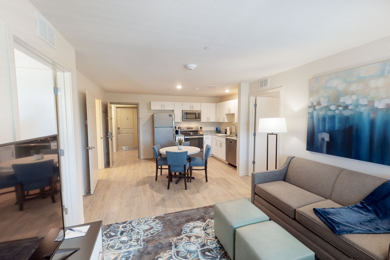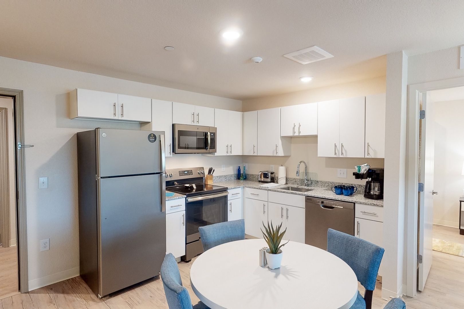 Two-bedroom, two-bathroom unfurnished suite featuring a modern kitchen equipped with full-size appliances, including a refrigerator, dishwasher, microwave, stove, and oven. It also features a full-size washer and dryer for added convenience. The living area offers ample comfort, while the bedroom is designed with a calming color palette, providing space for a queen-size bed and a closet system with smart storage shelving.