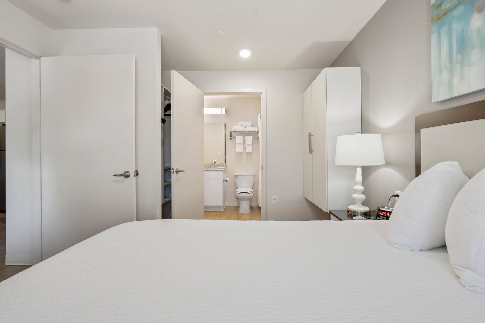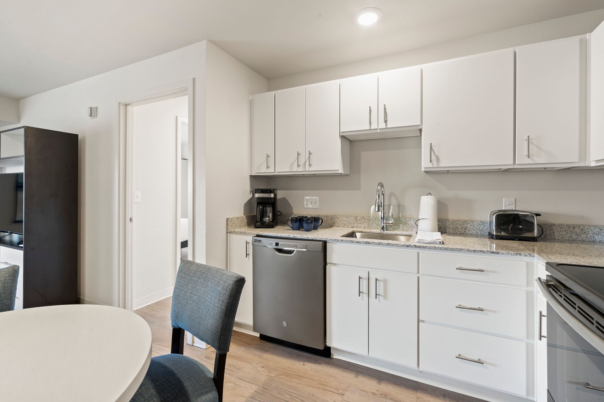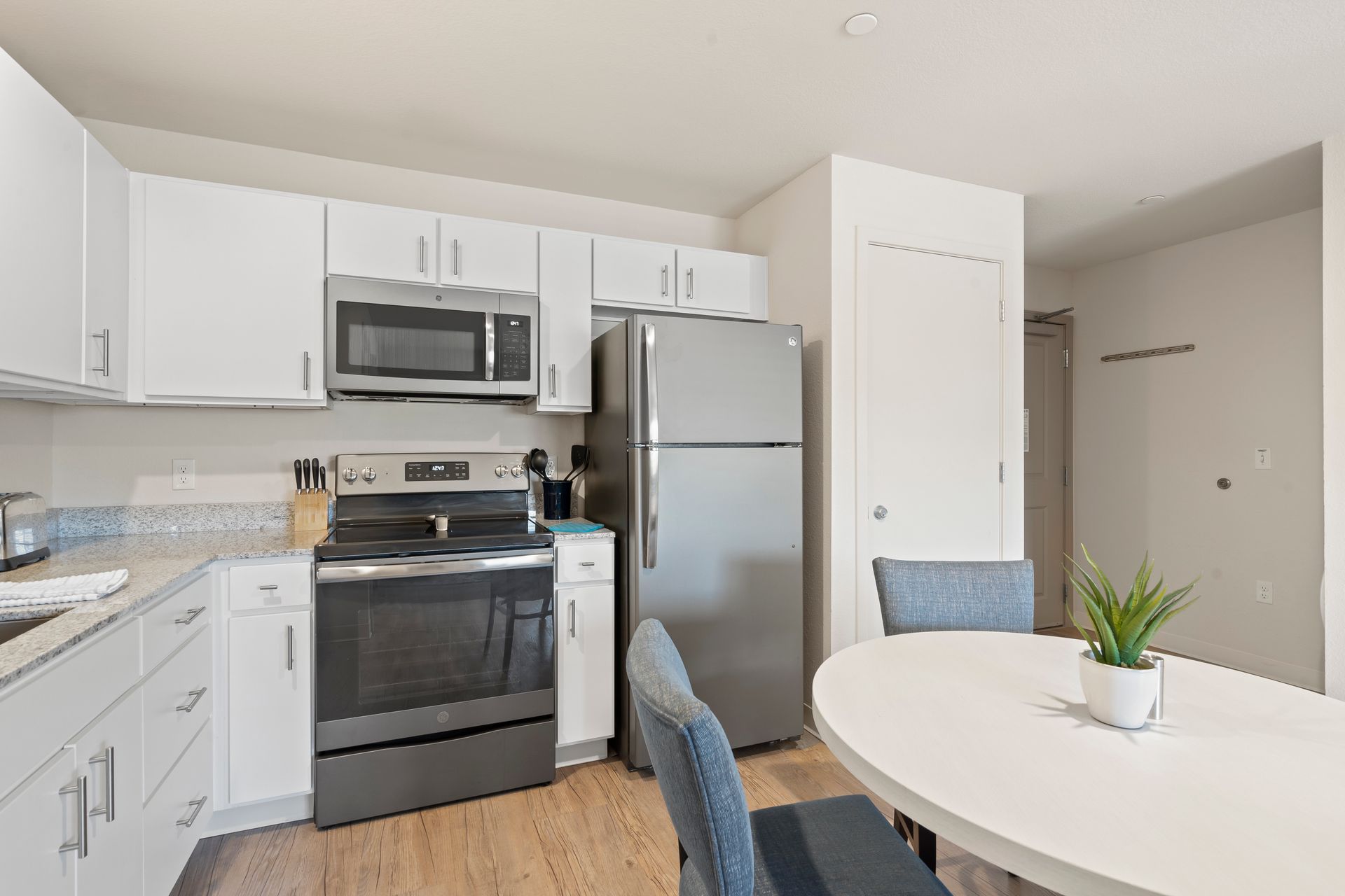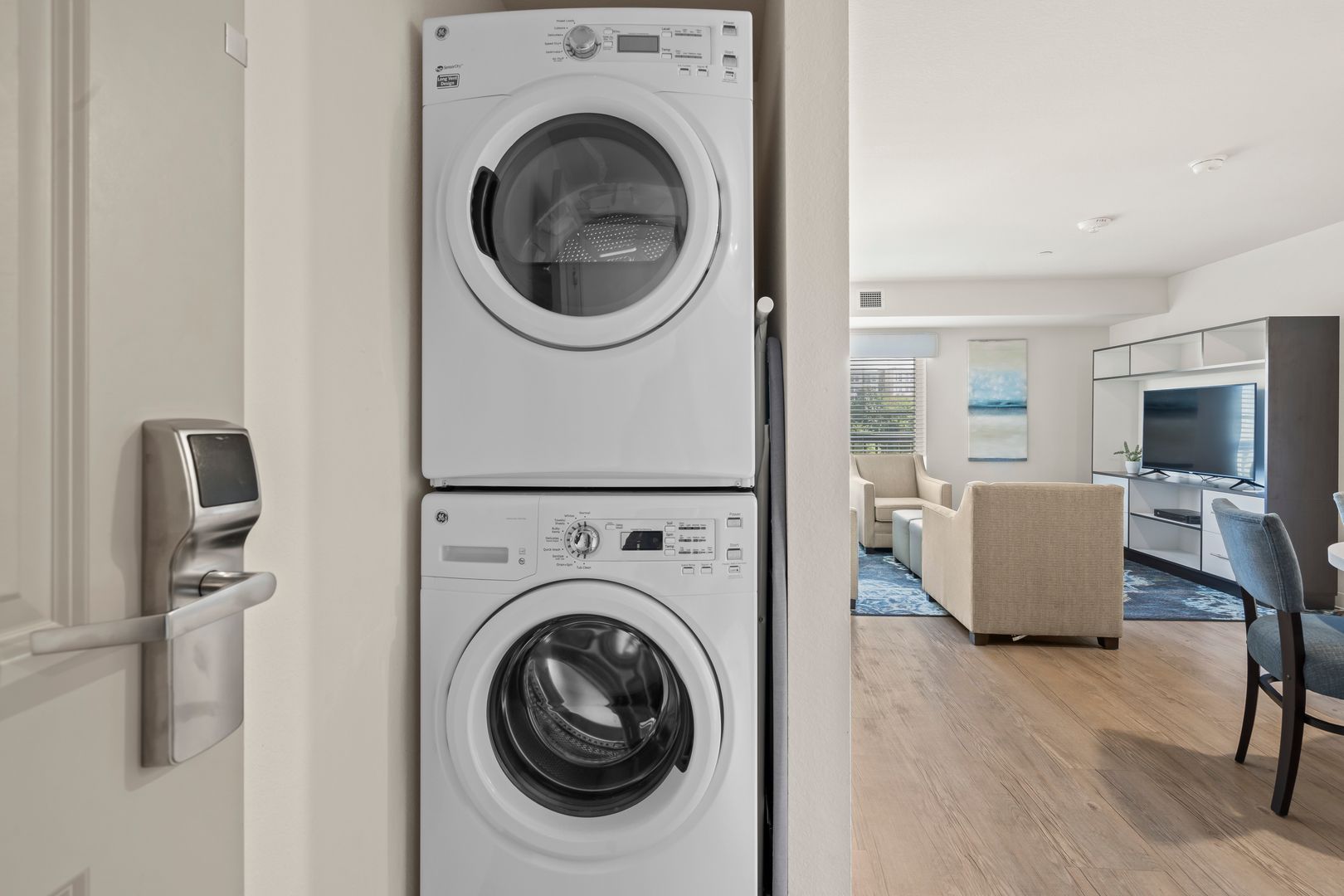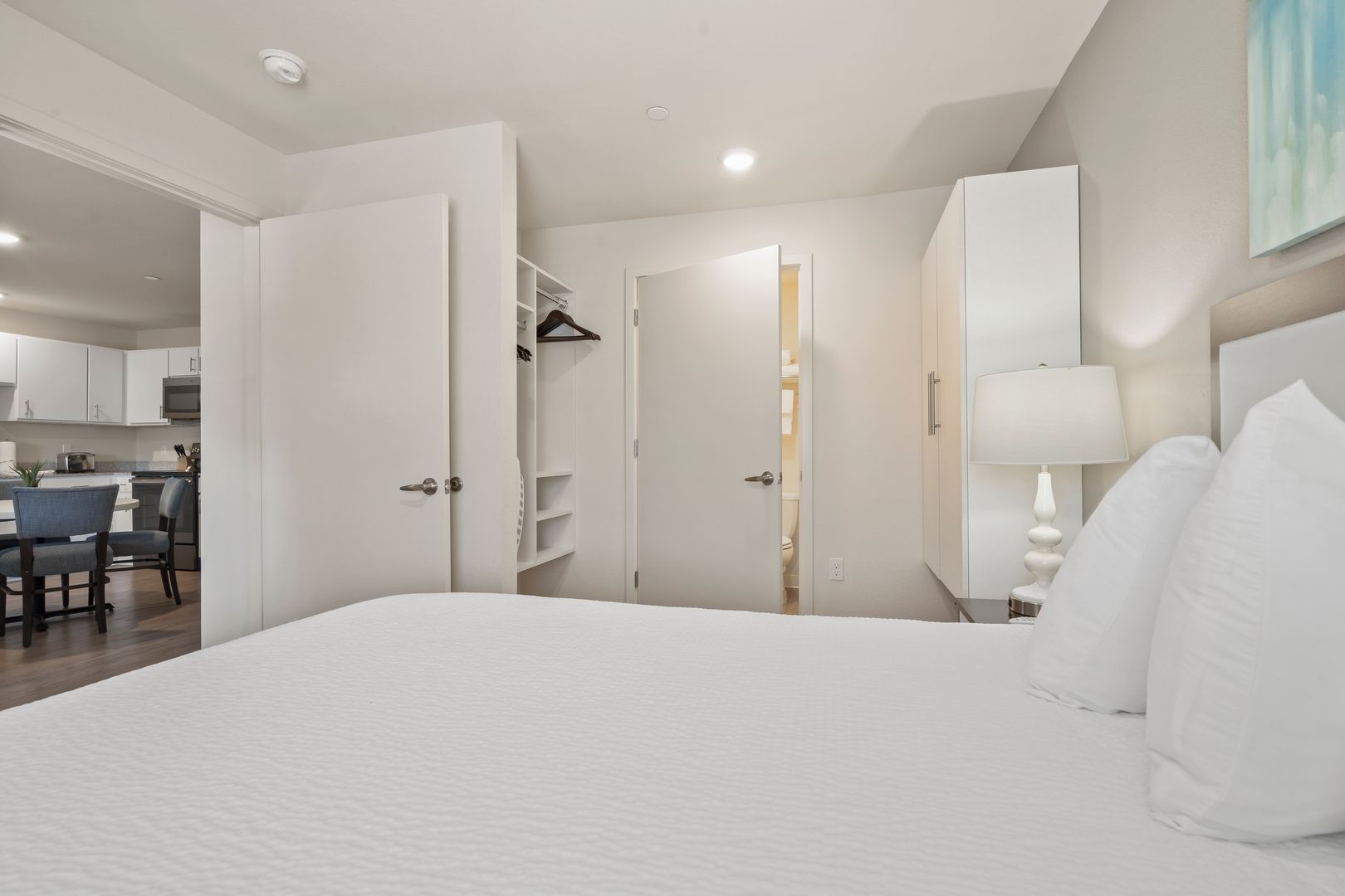 Three-bedroom, two-bathroom unfurnished suite featuring a modern kitchen equipped with full-size appliances, including a refrigerator, dishwasher, microwave, stove, and oven. It also features a full-size washer and dryer for added convenience. The living area offers ample comfort, while the bedroom is designed with a calming color palette, providing space for a queen-size bed and a closet system with smart storage shelving.