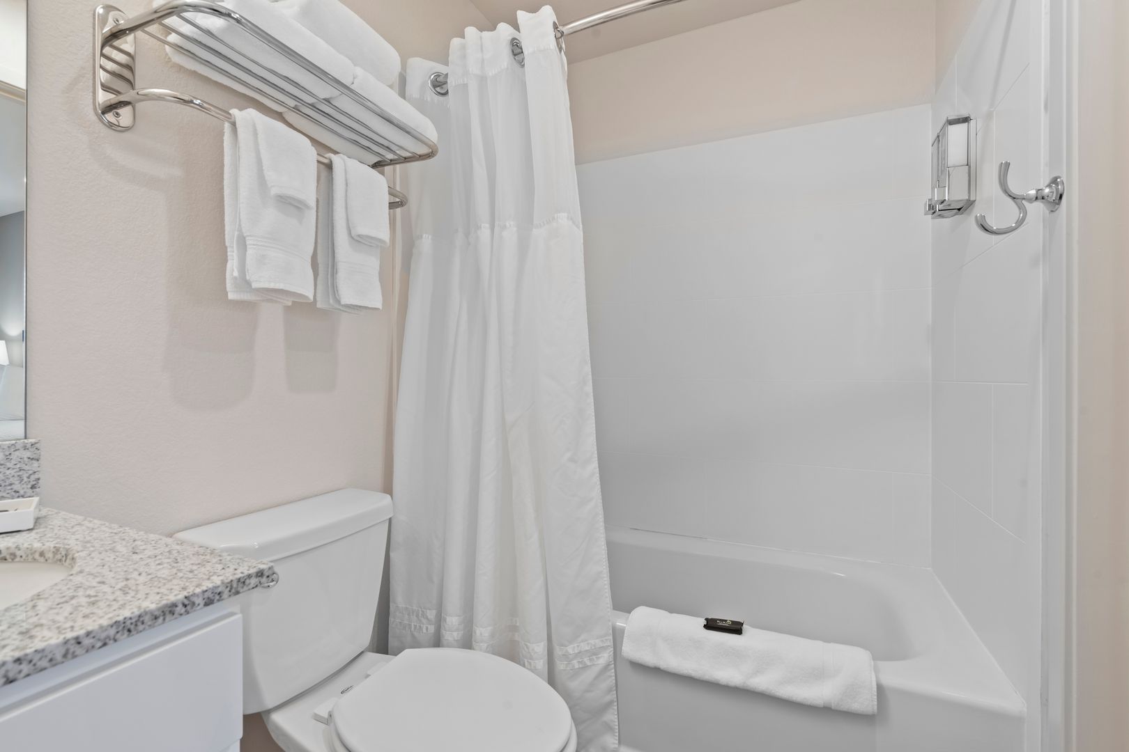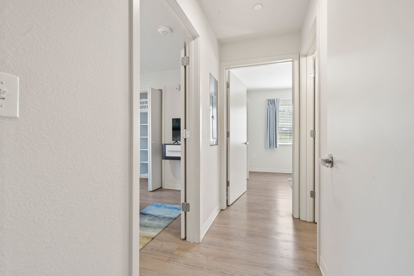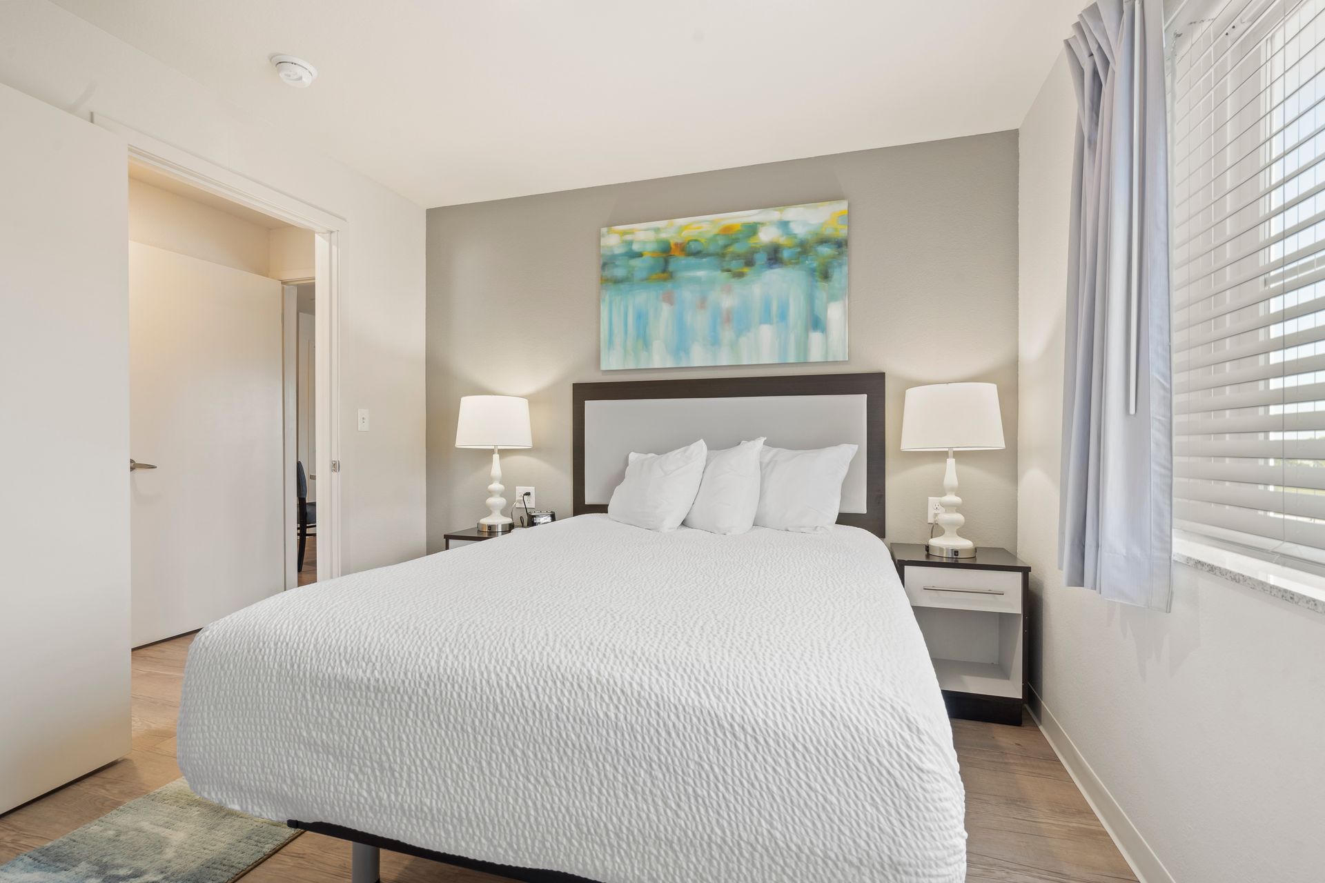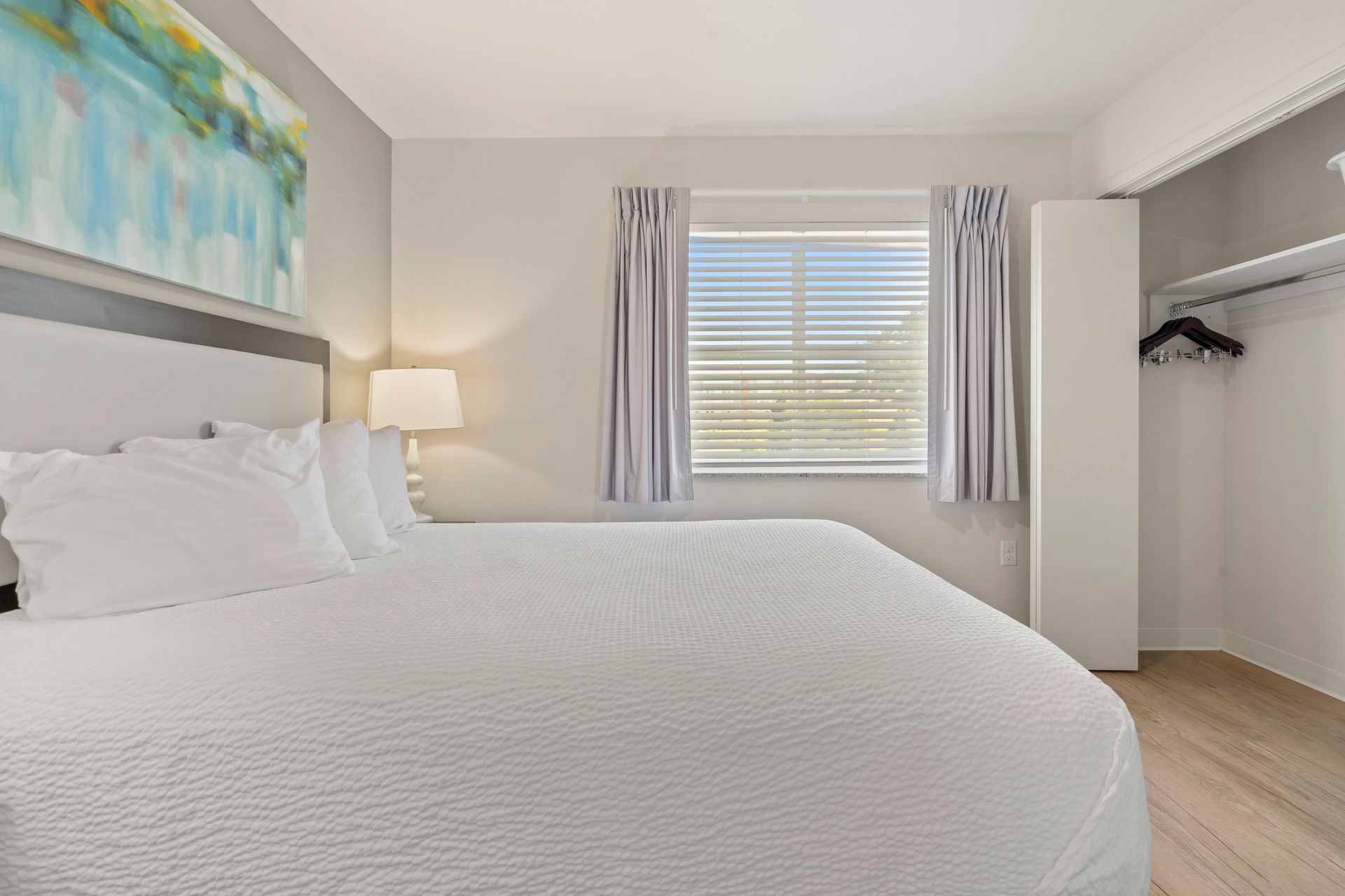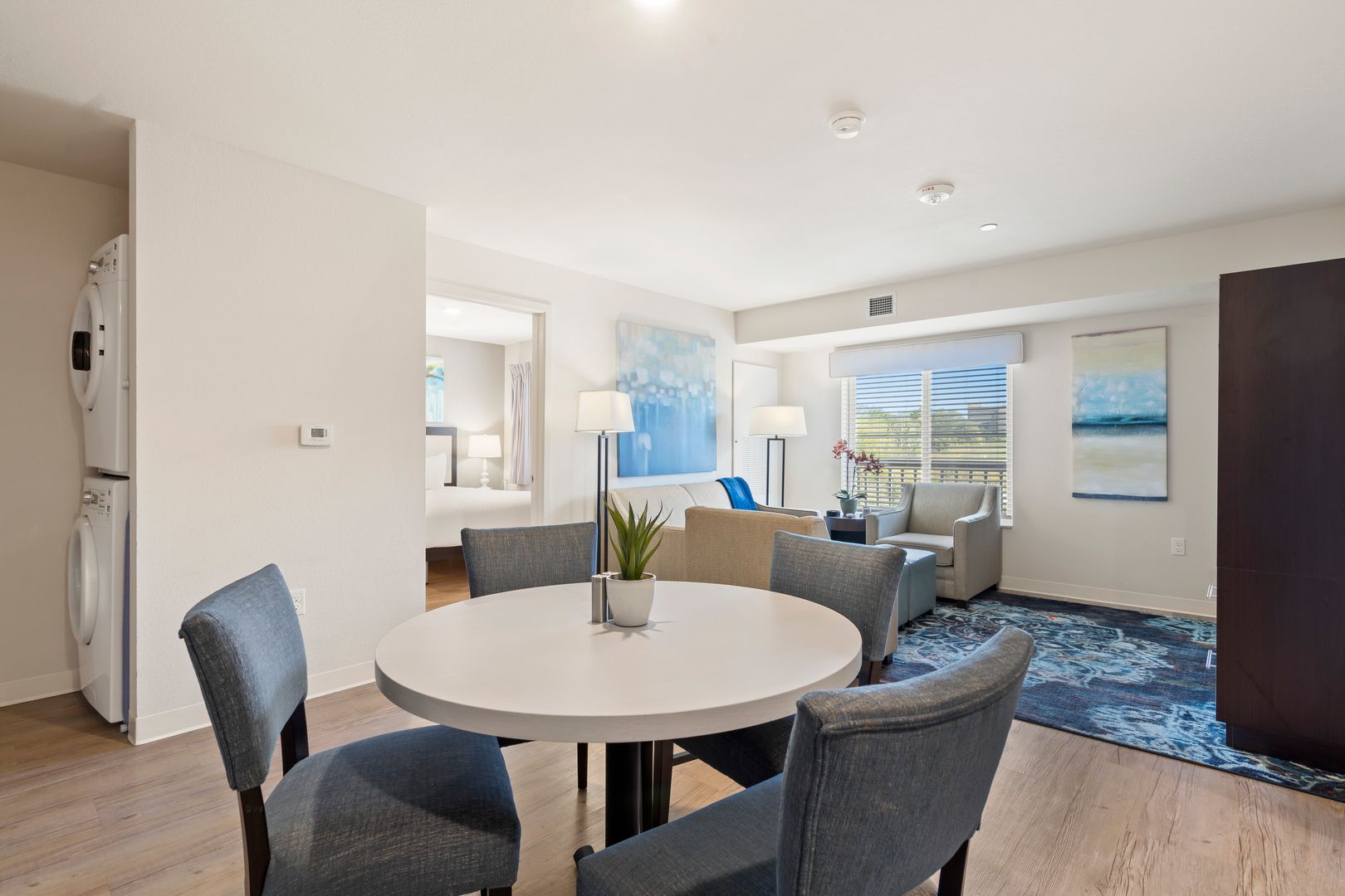 Three-bedroom, two-bathroom unfurnished suite featuring a modern kitchen equipped with full-size appliances, including a refrigerator, dishwasher, microwave, stove, and oven. It also features a full-size washer and dryer for added convenience. The living area offers ample comfort, while the bedroom is designed with a calming color palette, providing space for a queen-size bed and a closet system with smart storage shelving.