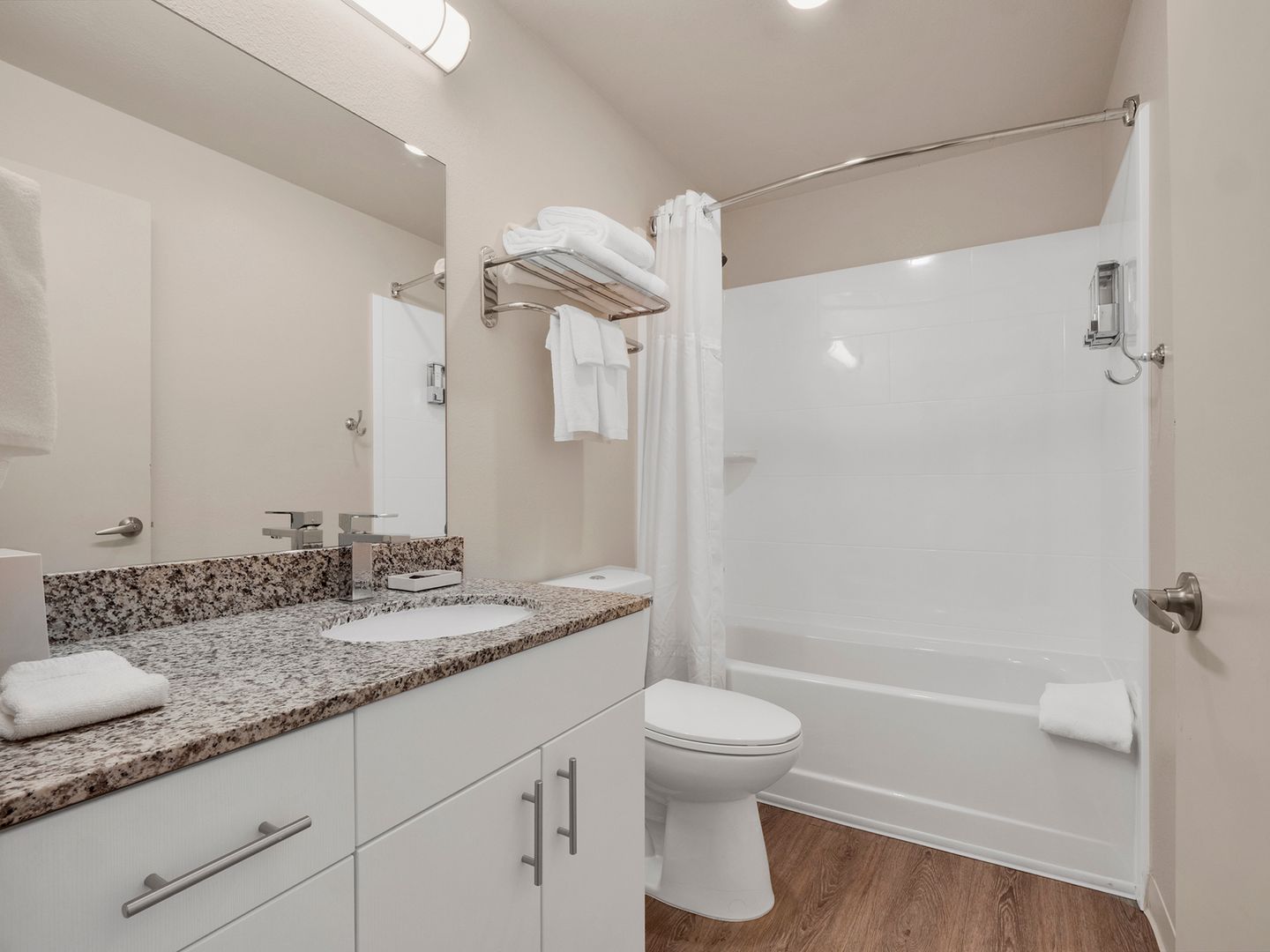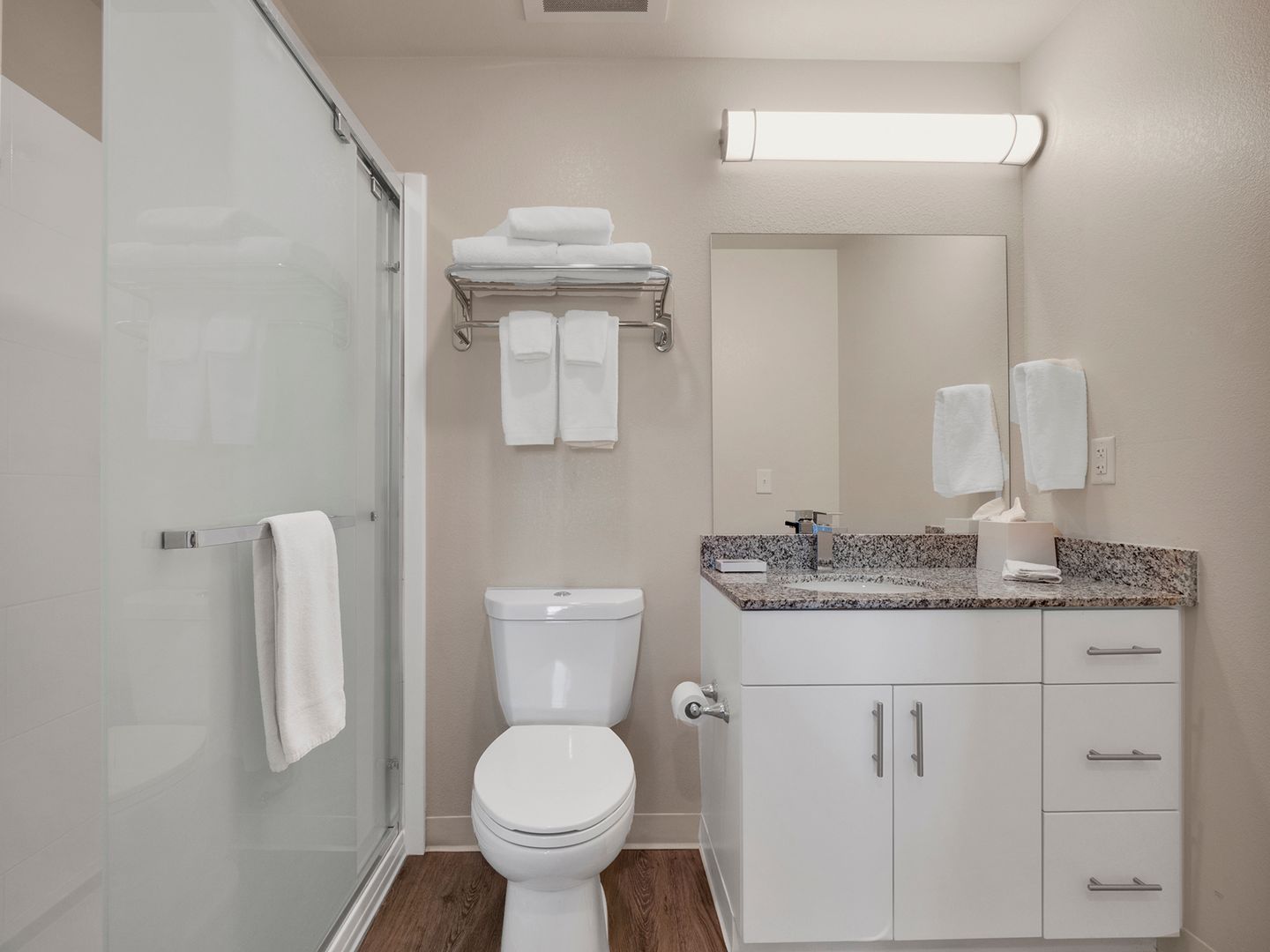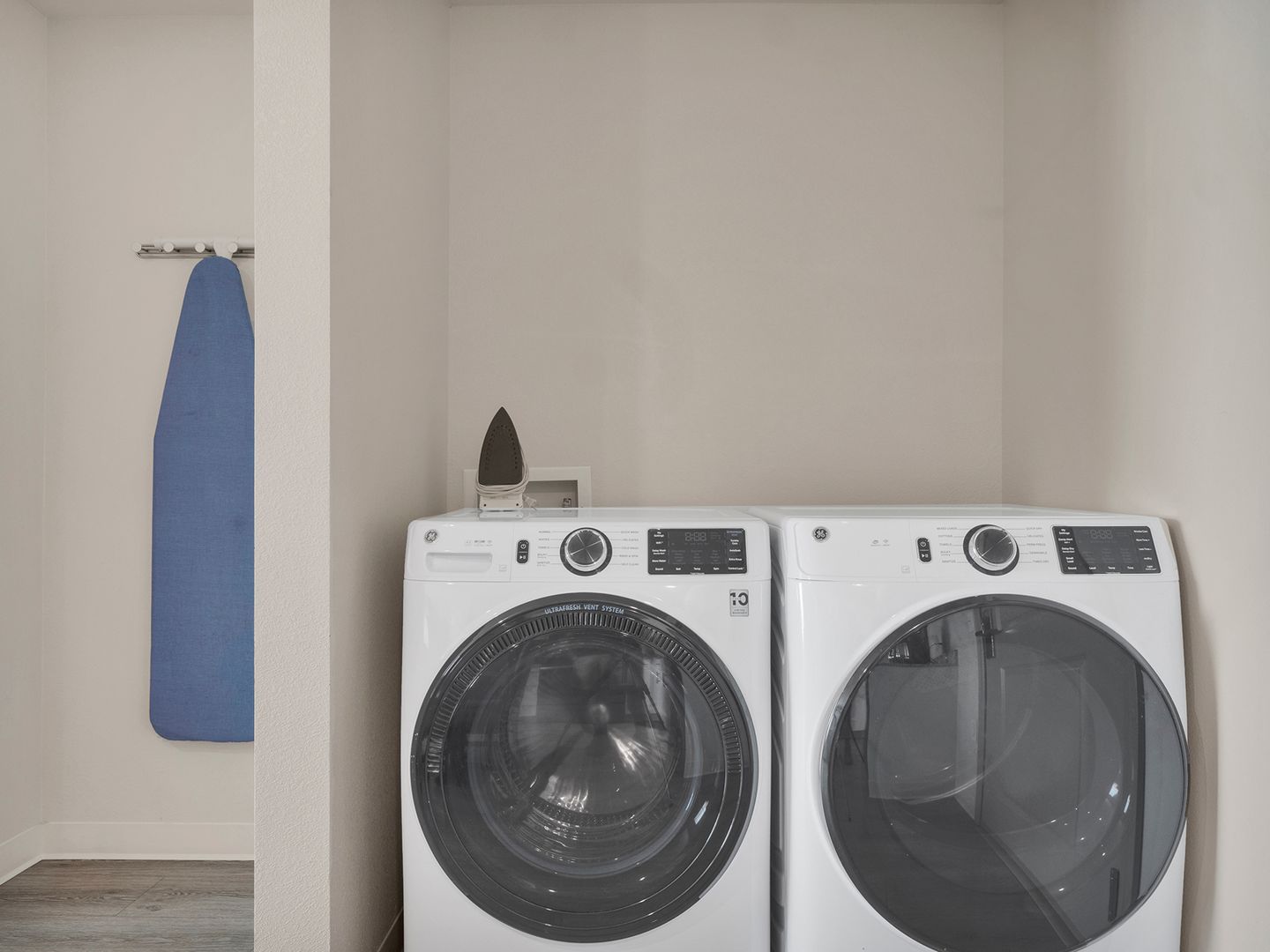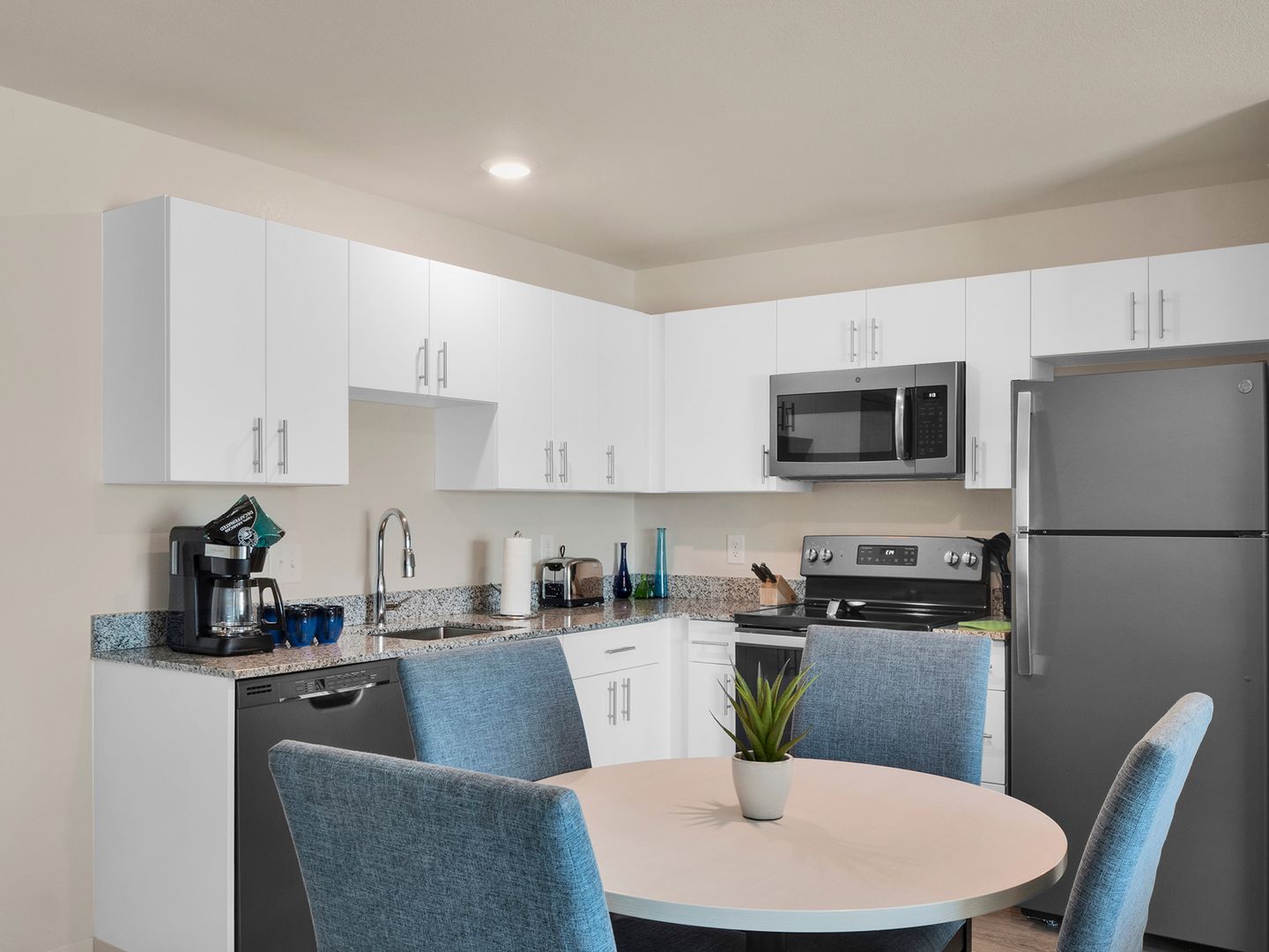 Three-bedroom, two-bathroom unfurnished suite featuring a modern kitchen equipped with full-size appliances, including a refrigerator, dishwasher, microwave, stove, and oven. It also features a full-size washer and dryer for added convenience. The living area offers ample comfort, while the bedroom is designed with a calming color palette, providing space for a queen-size bed and a closet system with smart storage shelving.