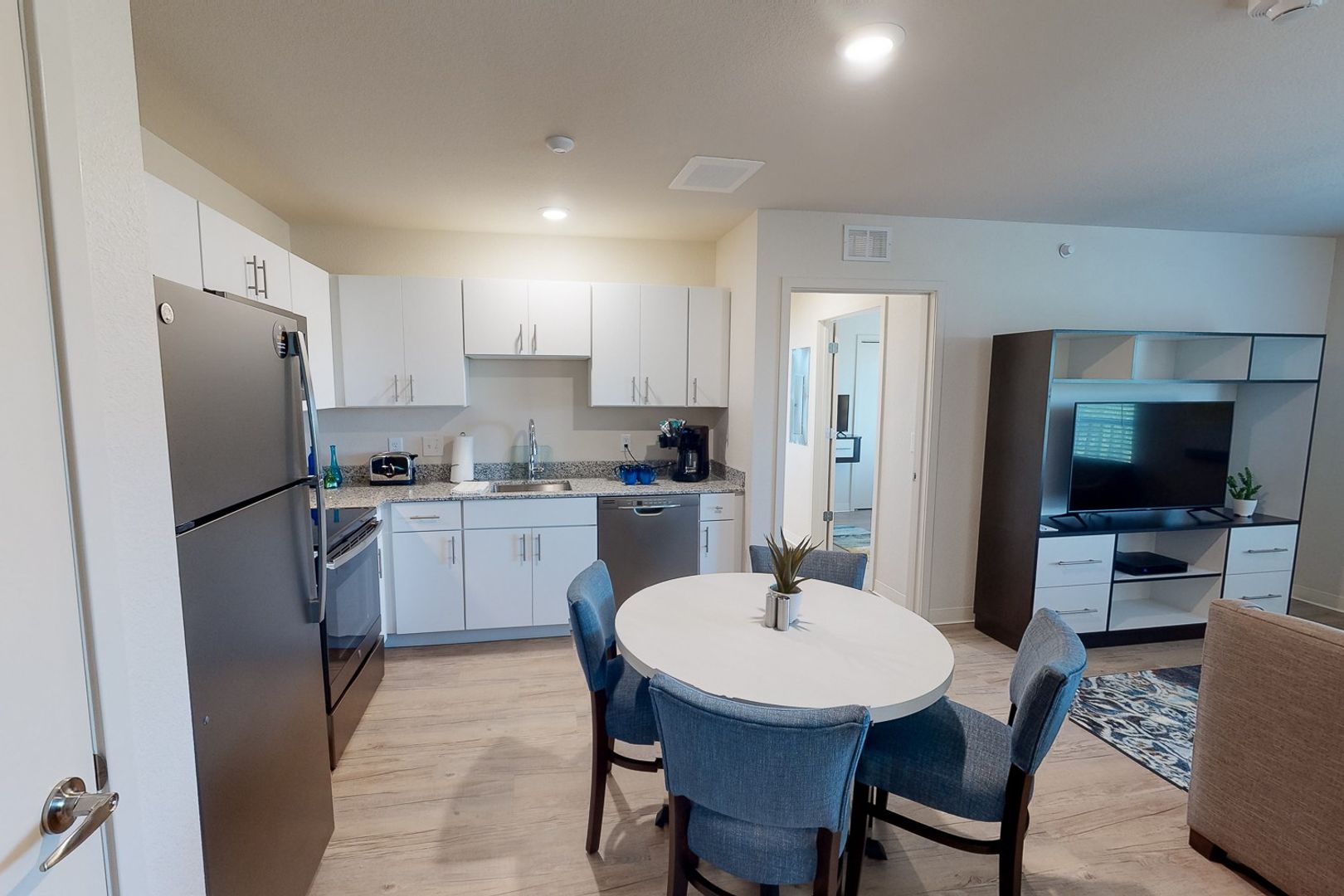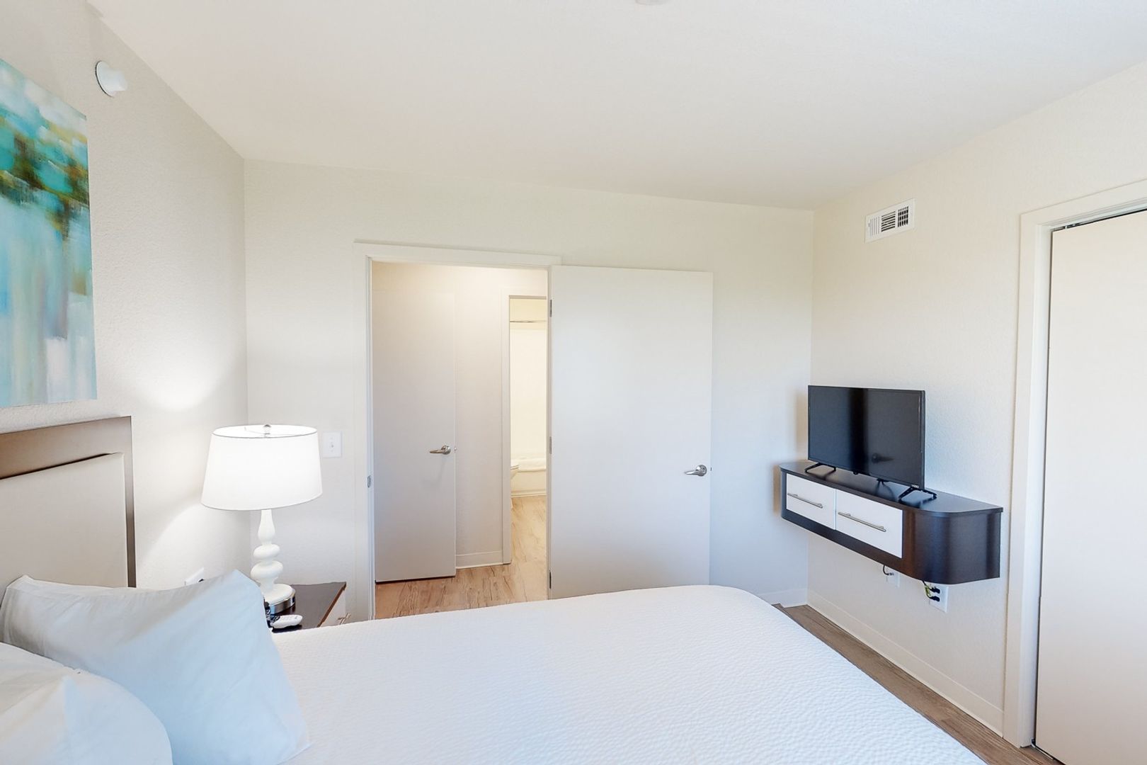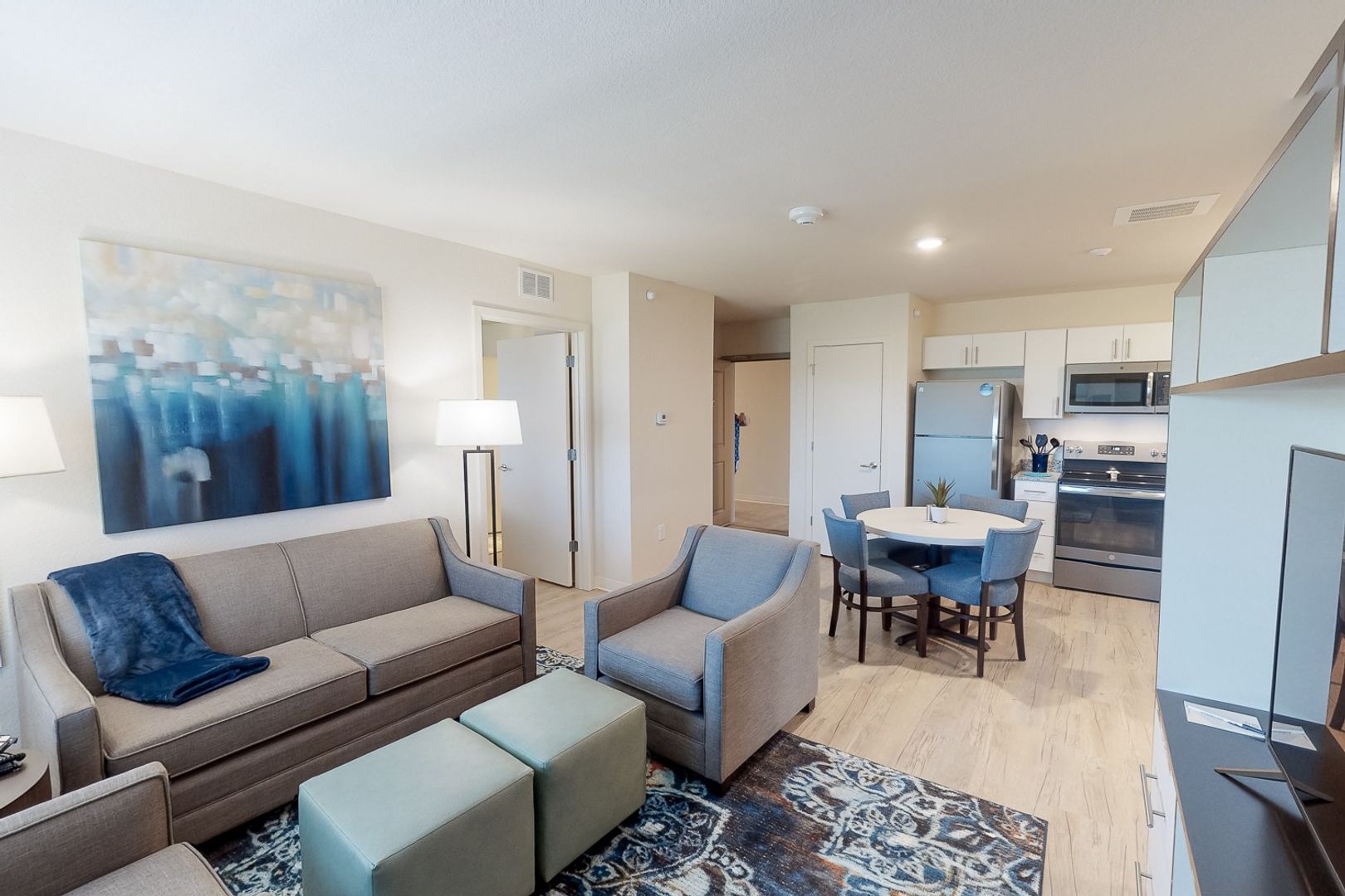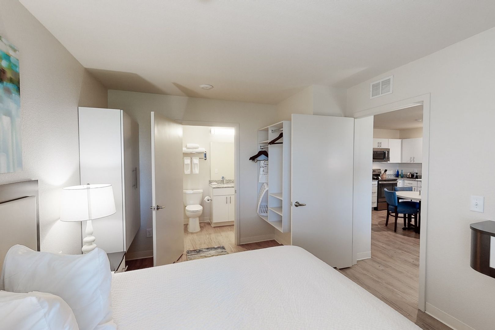 Three-bedroom, two-bathroom unfurnished suite featuring a modern kitchen equipped with full-size appliances, including a refrigerator, dishwasher, microwave, stove, and oven. It also features a full-size washer and dryer for added convenience. The living area offers ample comfort, while the bedroom is designed with a calming color palette, providing space for a queen-size bed and a closet system with smart storage shelving.