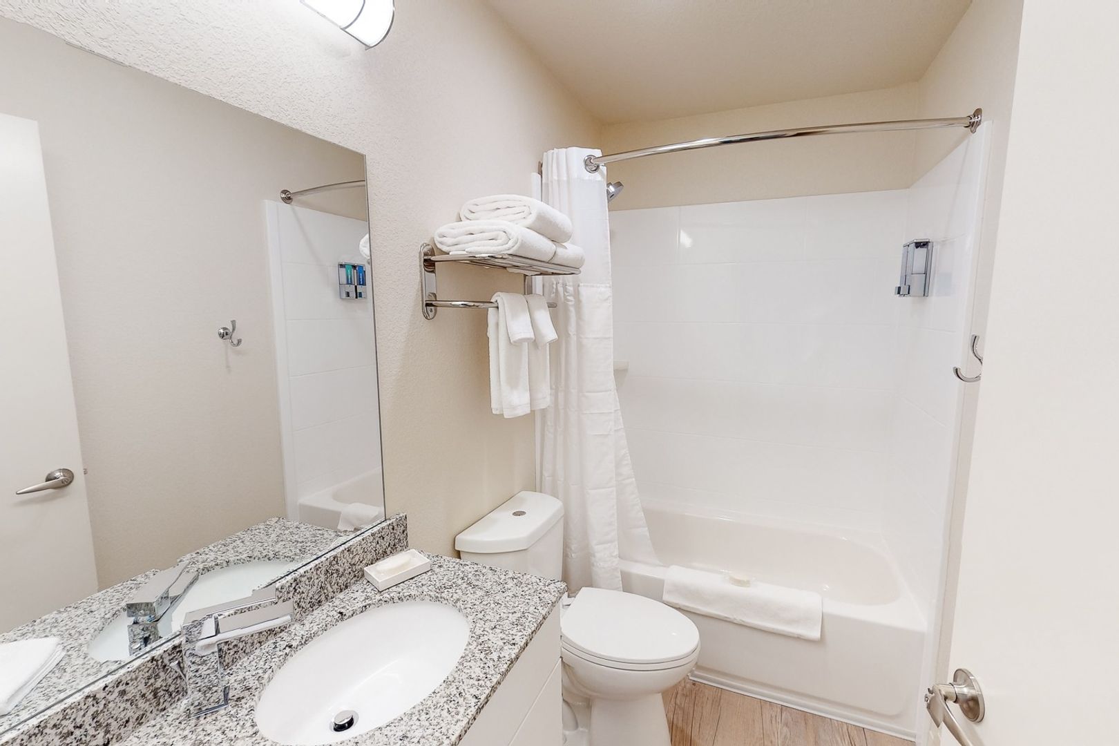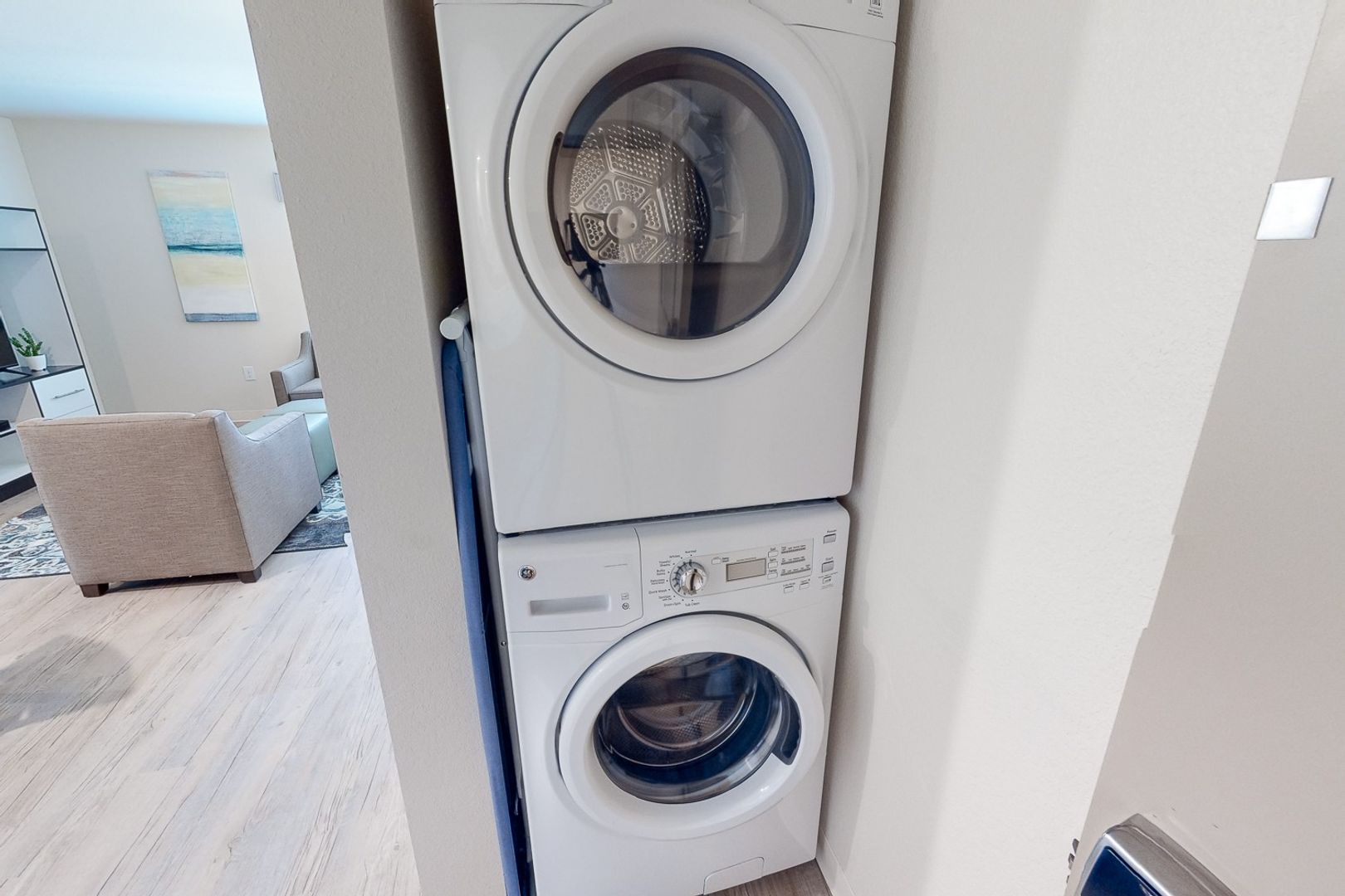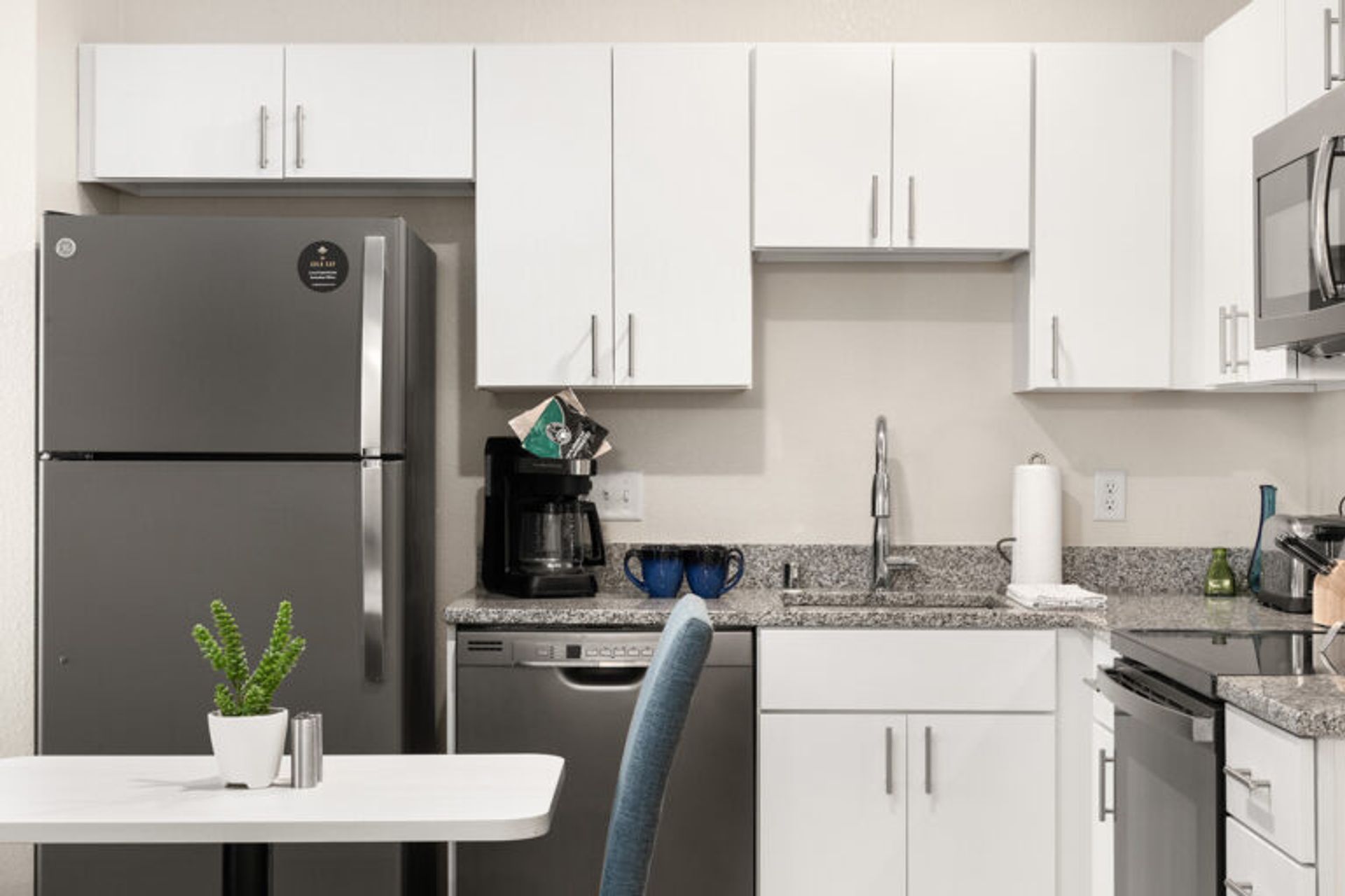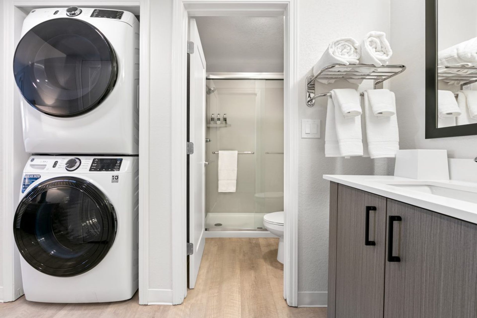 Three-bedroom, two-bathroom unfurnished suite featuring a modern kitchen equipped with full-size appliances, including a refrigerator, dishwasher, microwave, stove, and oven. It also features a full-size washer and dryer for added convenience. The living area offers ample comfort, while the bedroom is designed with a calming color palette, providing space for a queen-size bed and a closet system with smart storage shelving.