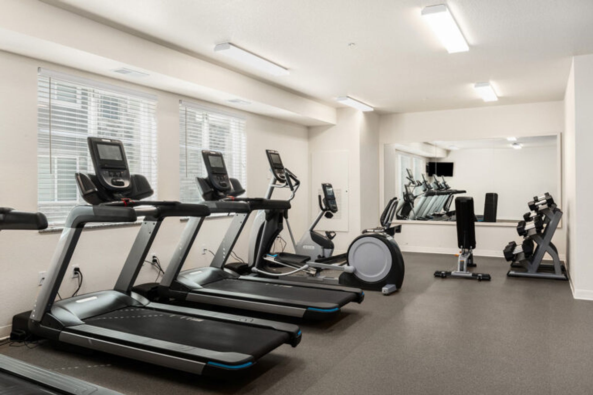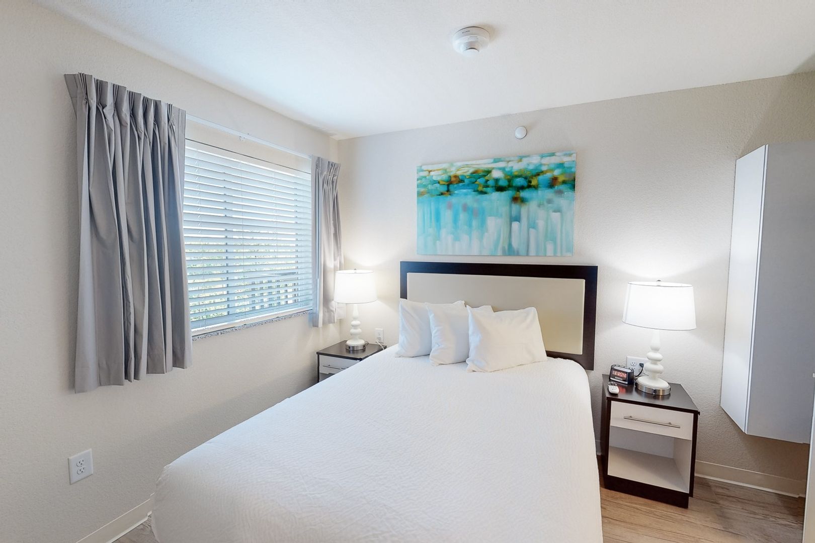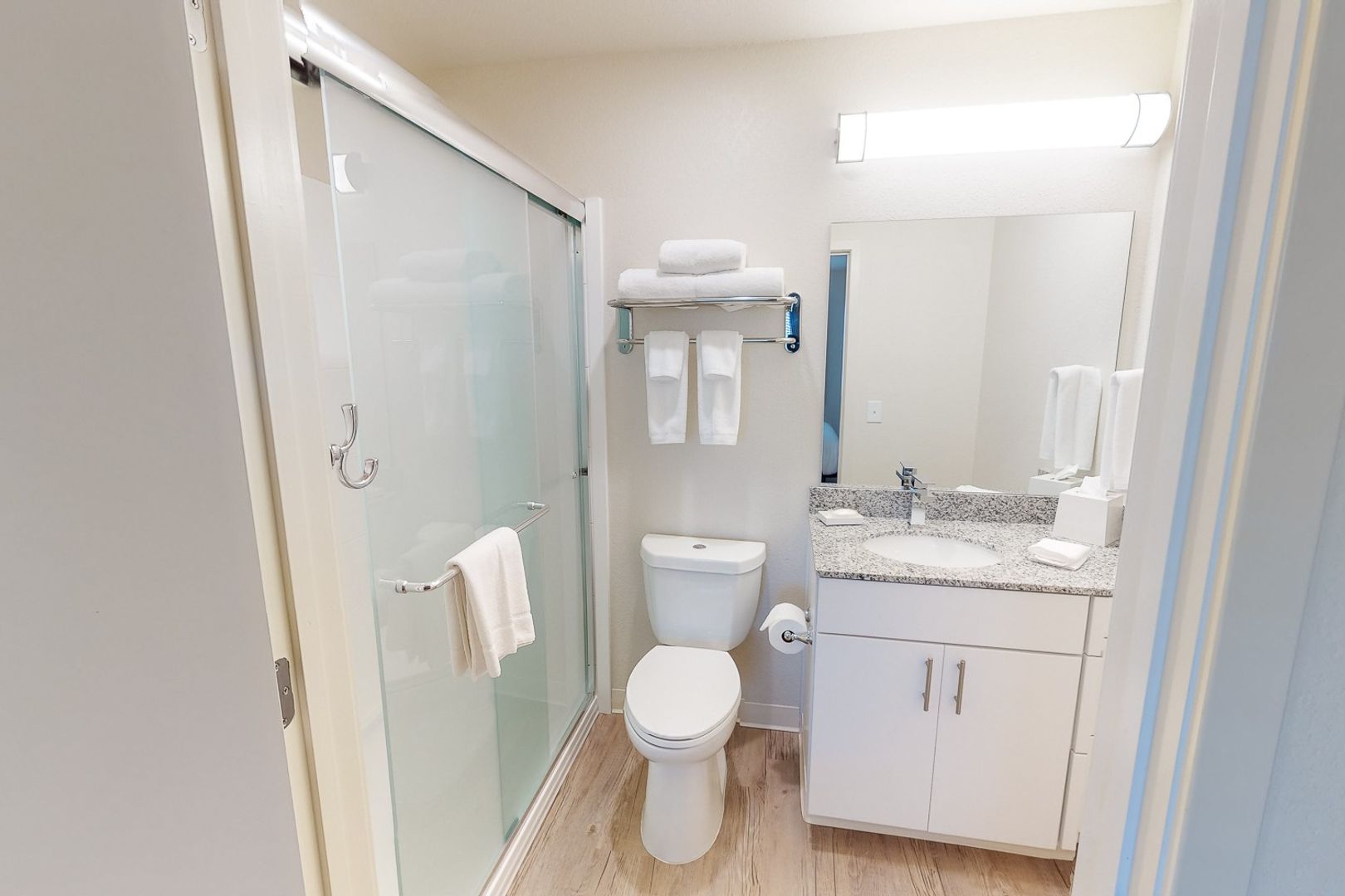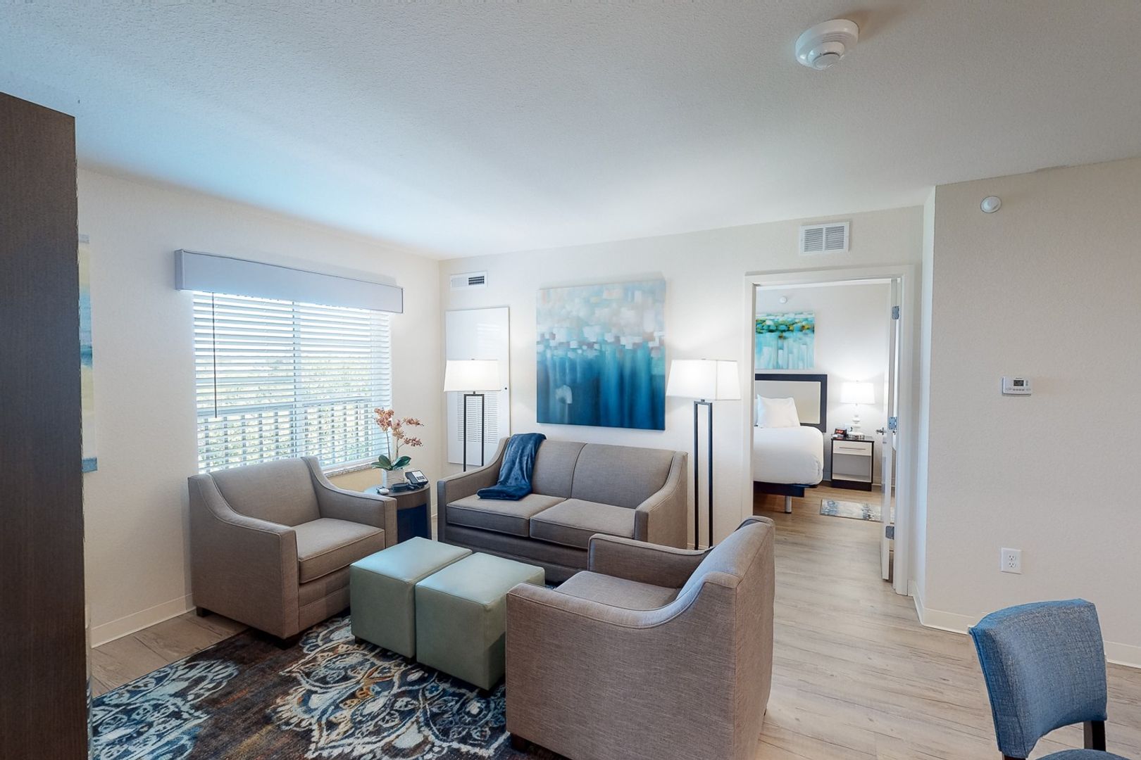 Three-bedroom, two-bathroom unfurnished suite featuring a modern kitchen equipped with full-size appliances, including a refrigerator, dishwasher, microwave, stove, and oven. It also features a full-size washer and dryer for added convenience. The living area offers ample comfort, while the bedroom is designed with a calming color palette, providing space for a queen-size bed and a closet system with smart storage shelving.