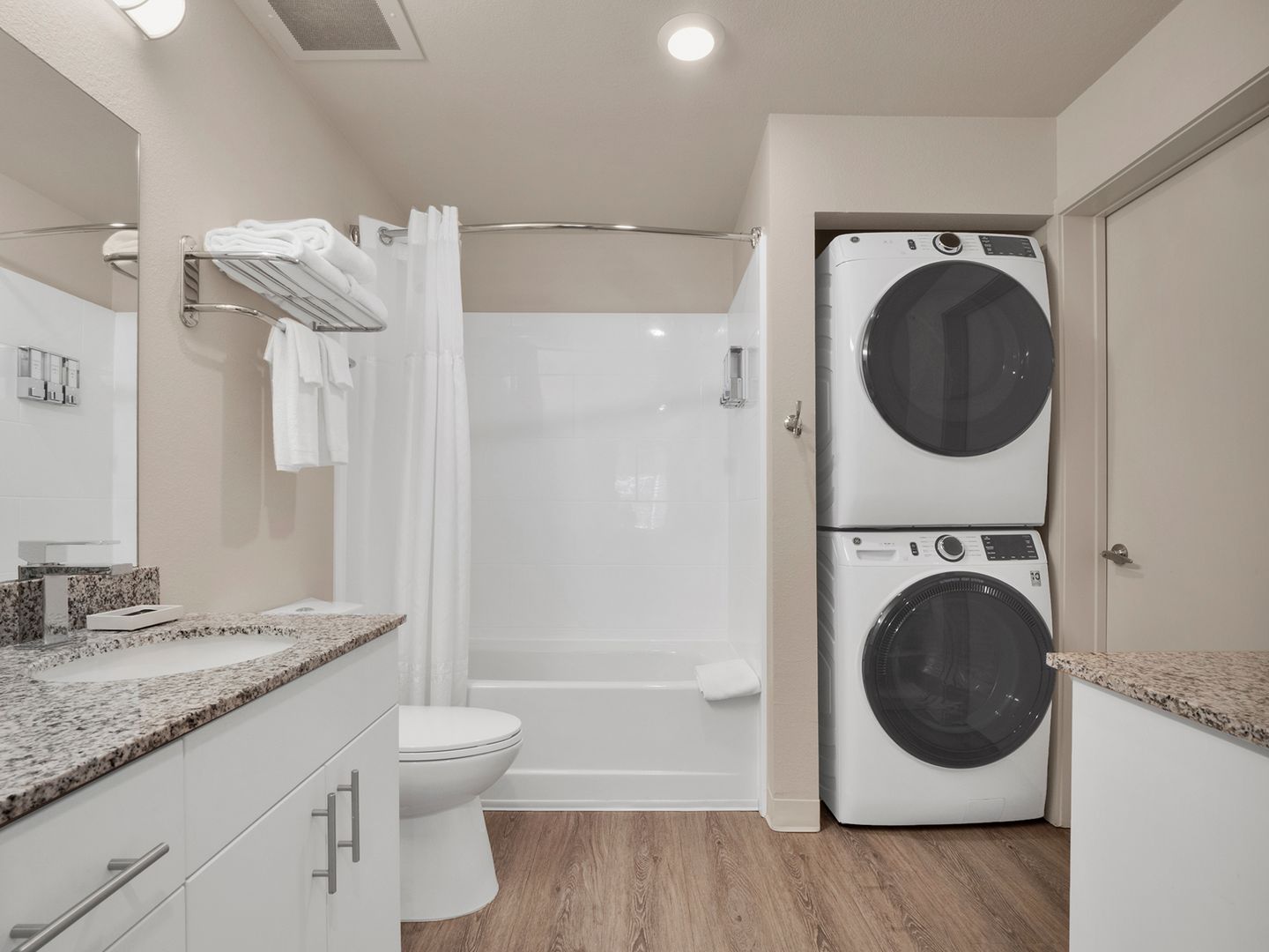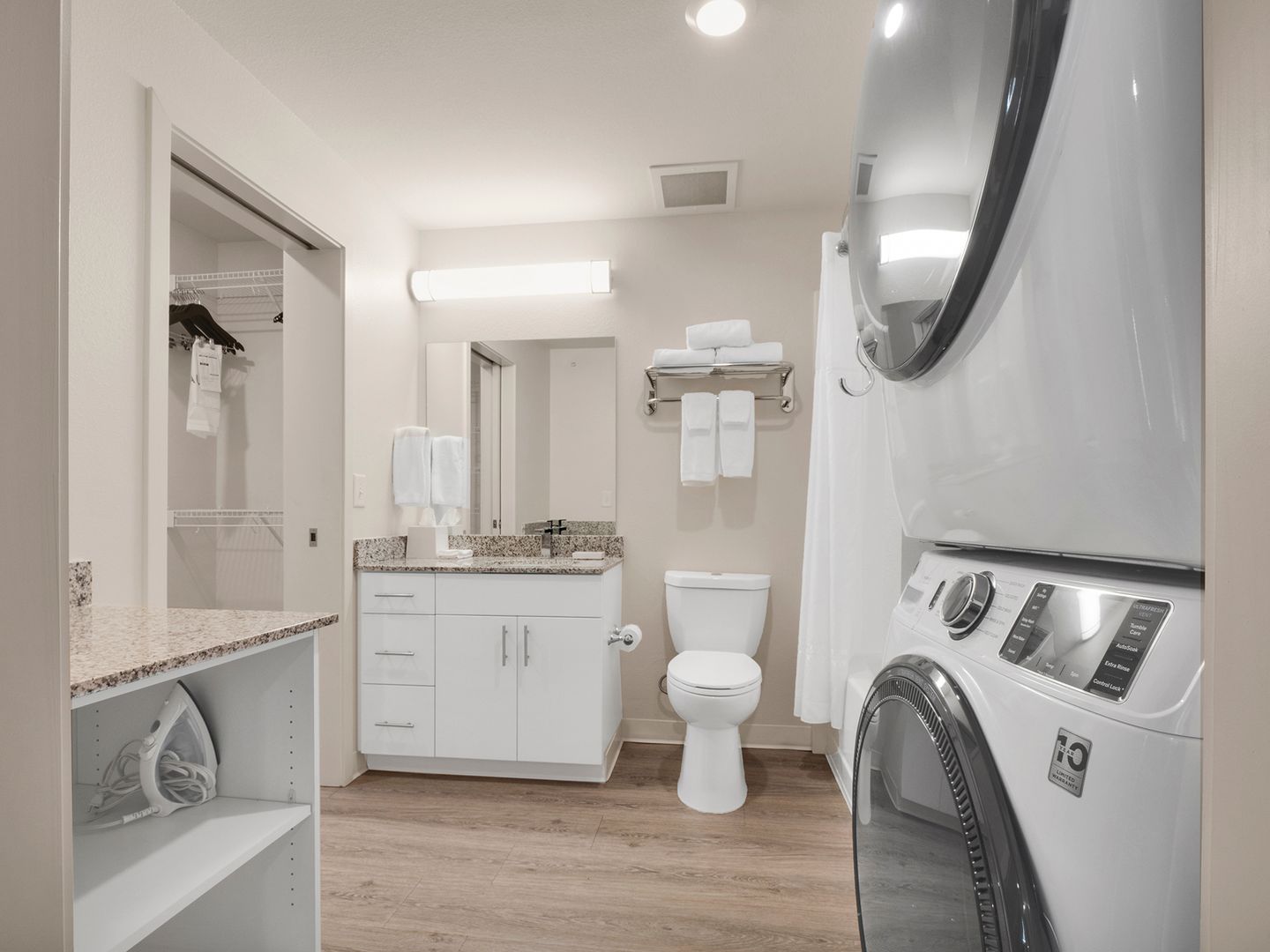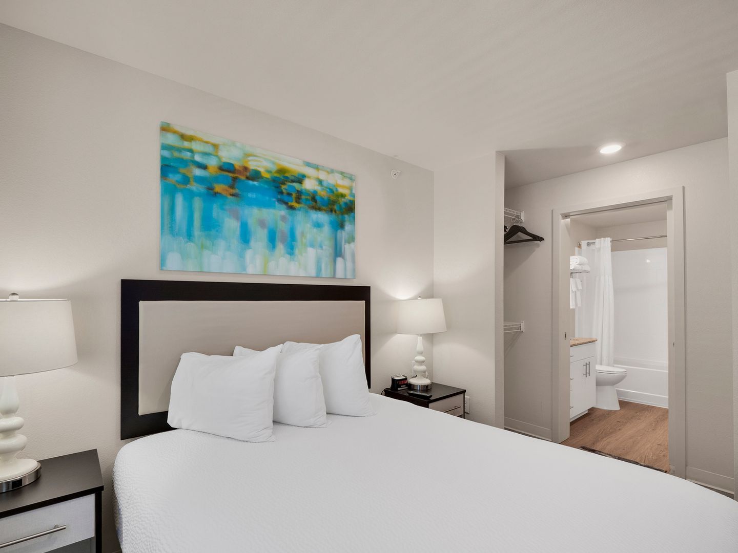 Two-bedroom, two-bathroom unfurnished suite with private balcony featuring a modern kitchen equipped with full-size appliances, including a refrigerator, dishwasher, microwave, stove, and oven. It also features a full-size washer and dryer for added convenience. The living area offers ample comfort, while the bedroom is designed with a calming color palette, providing space for a queen-size bed and a closet system with smart storage shelving.