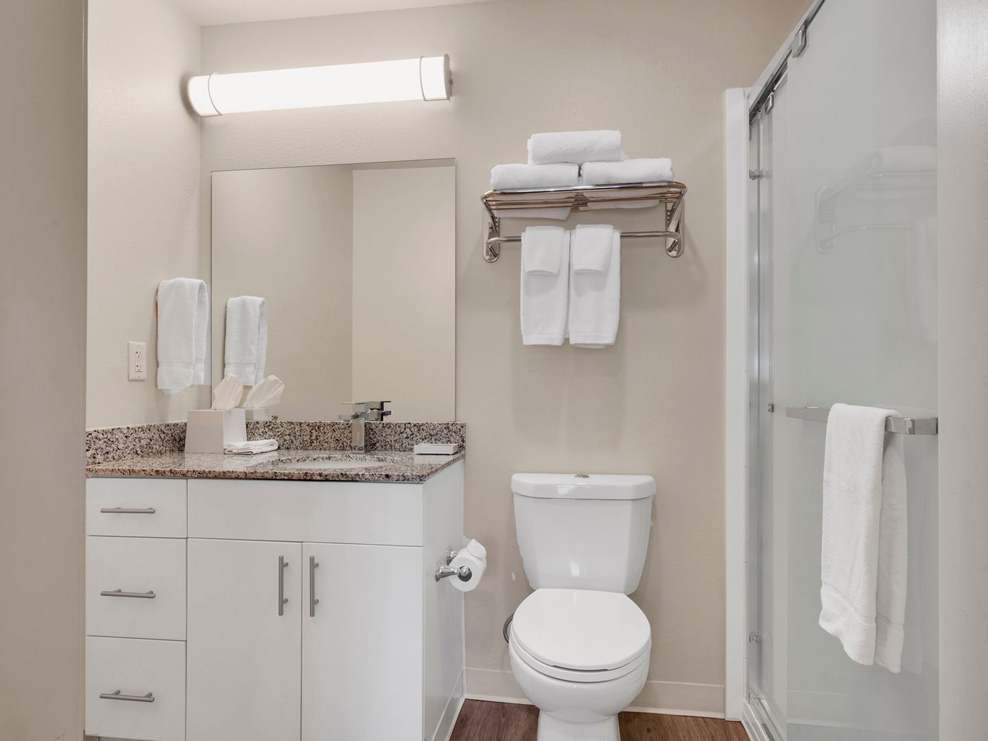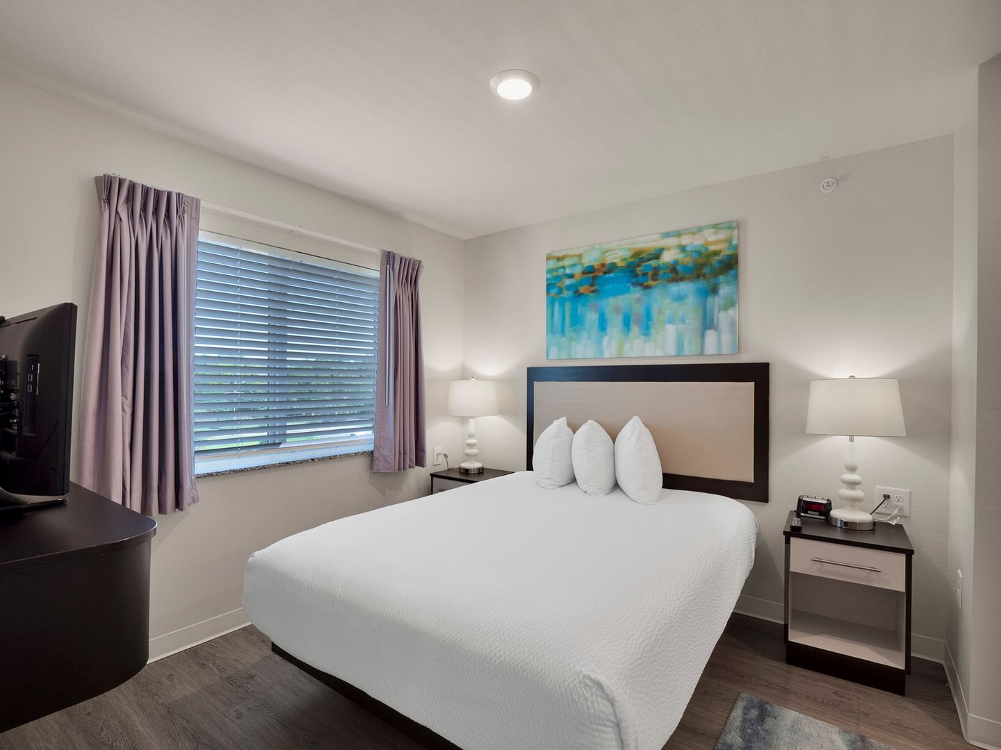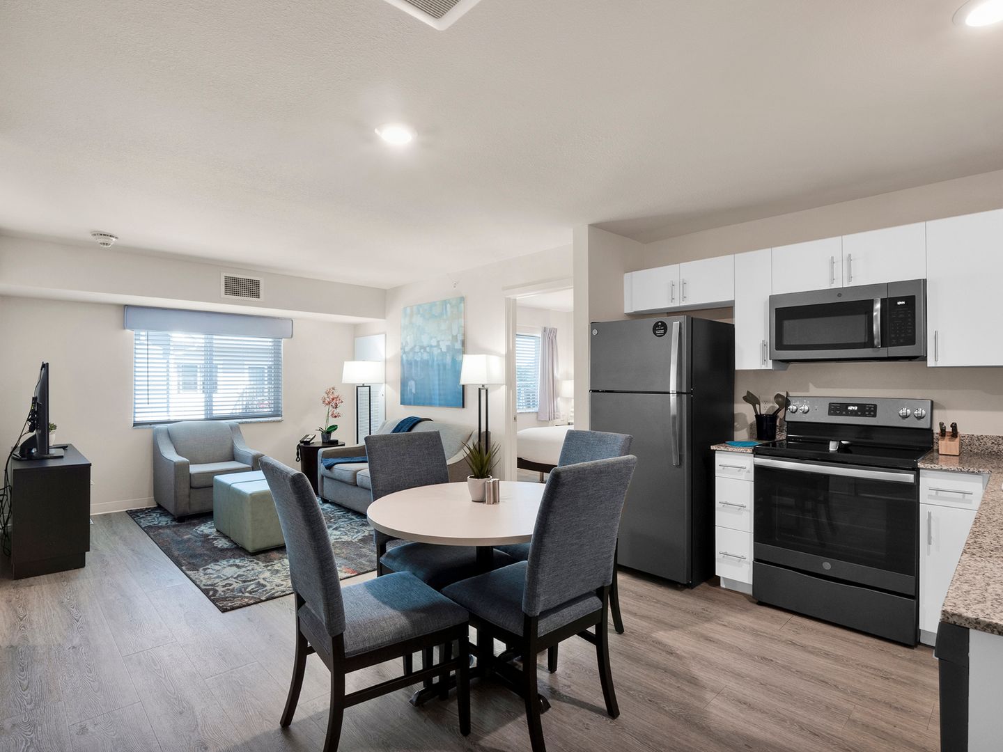 Two-bedroom, two-bathroom unfurnished suite with private balcony featuring a modern kitchen equipped with full-size appliances, including a refrigerator, dishwasher, microwave, stove, and oven. It also features a full-size washer and dryer for added convenience. The living area offers ample comfort, while the bedroom is designed with a calming color palette, providing space for a queen-size bed and a closet system with smart storage shelving.