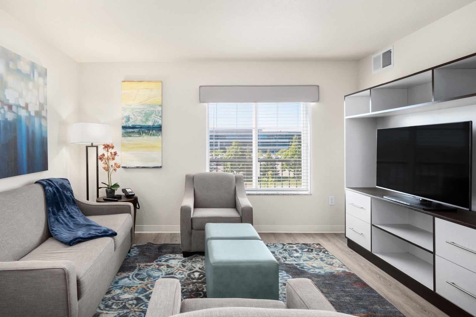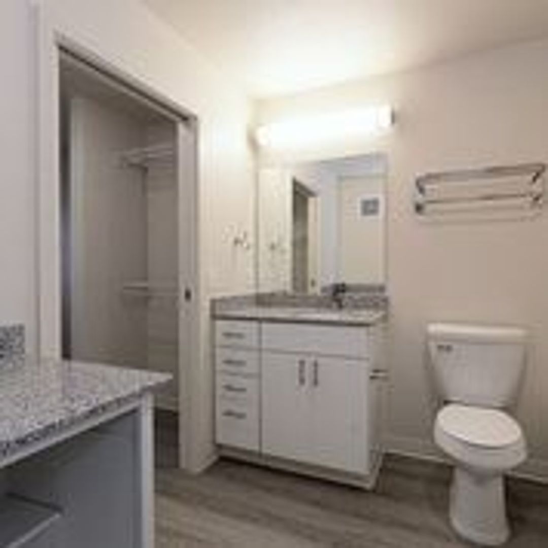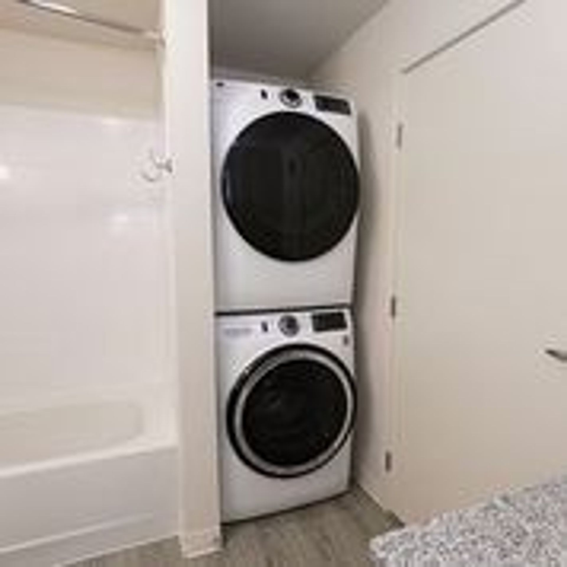 Two-bedroom, two-bathroom unfurnished suite with private balcony featuring a modern kitchen equipped with full-size appliances, including a refrigerator, dishwasher, microwave, stove, and oven. It also features a full-size washer and dryer for added convenience. The living area offers ample comfort, while the bedroom is designed with a calming color palette, providing space for a queen-size bed and a closet system with smart storage shelving.