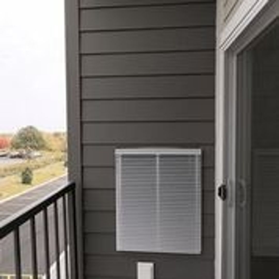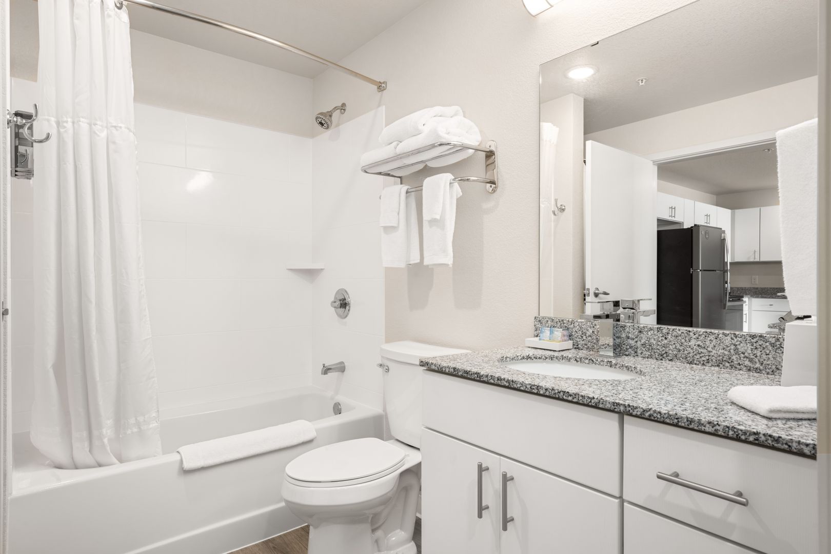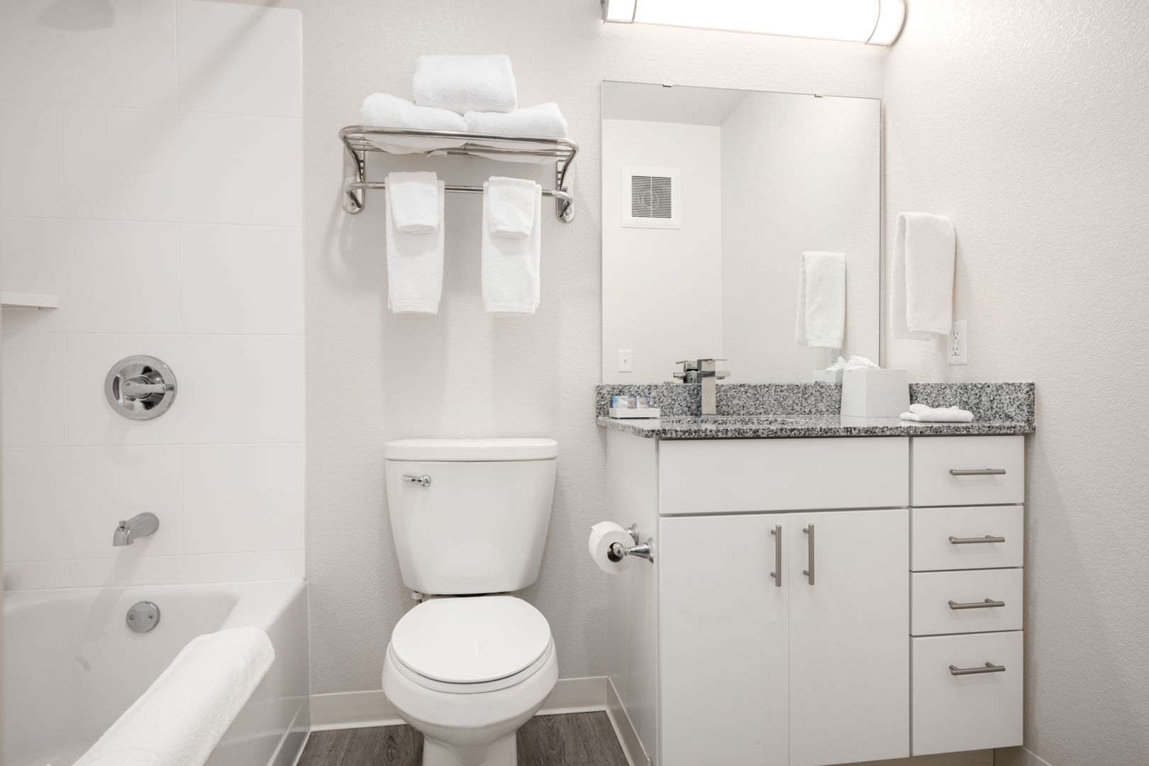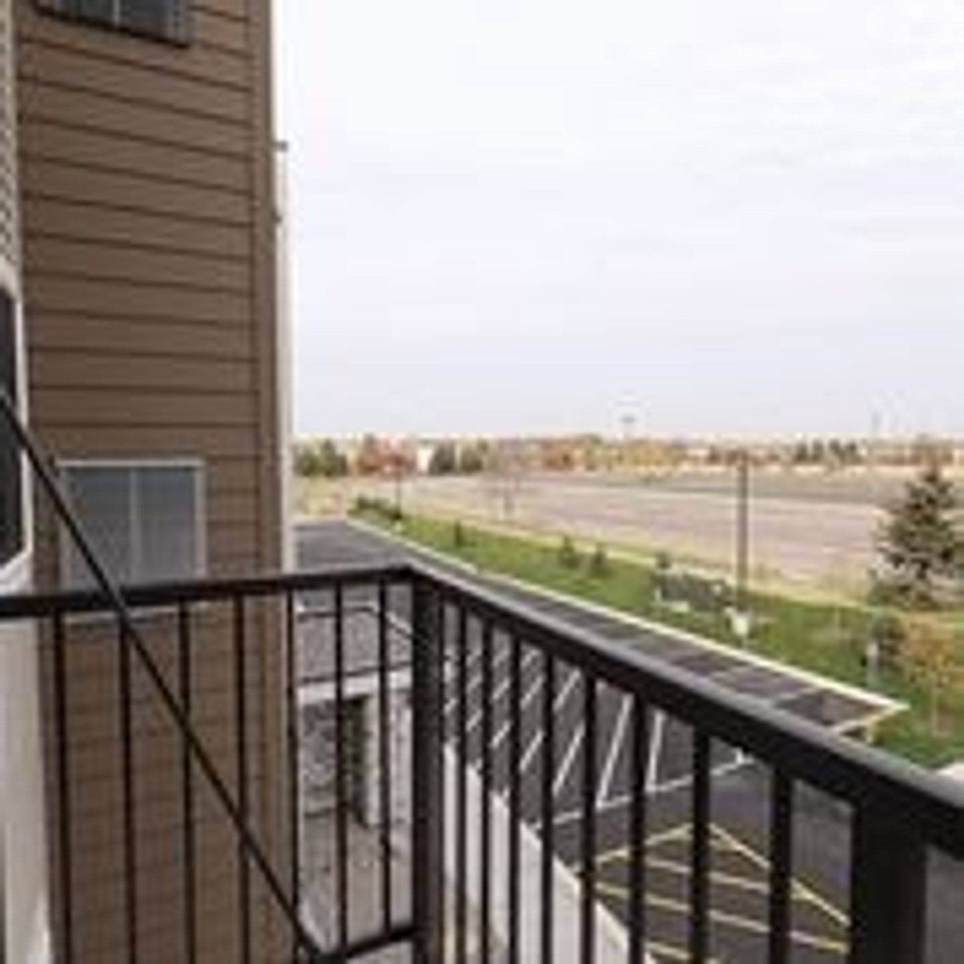 Two-bedroom, two-bathroom unfurnished suite with private balcony featuring a modern kitchen equipped with full-size appliances, including a refrigerator, dishwasher, microwave, stove, and oven. It also features a full-size washer and dryer for added convenience. The living area offers ample comfort, while the bedroom is designed with a calming color palette, providing space for a queen-size bed and a closet system with smart storage shelving.